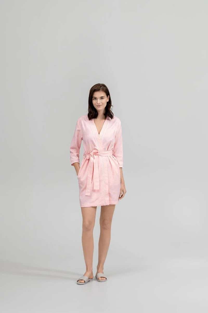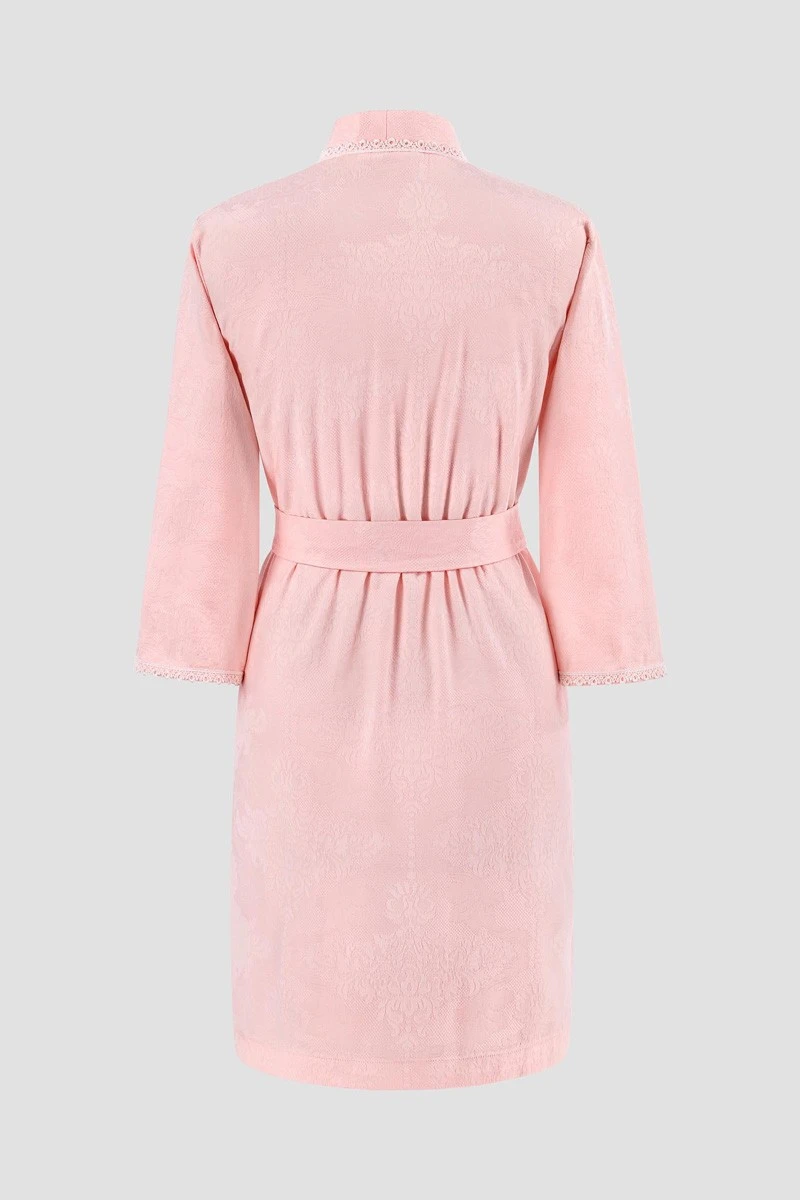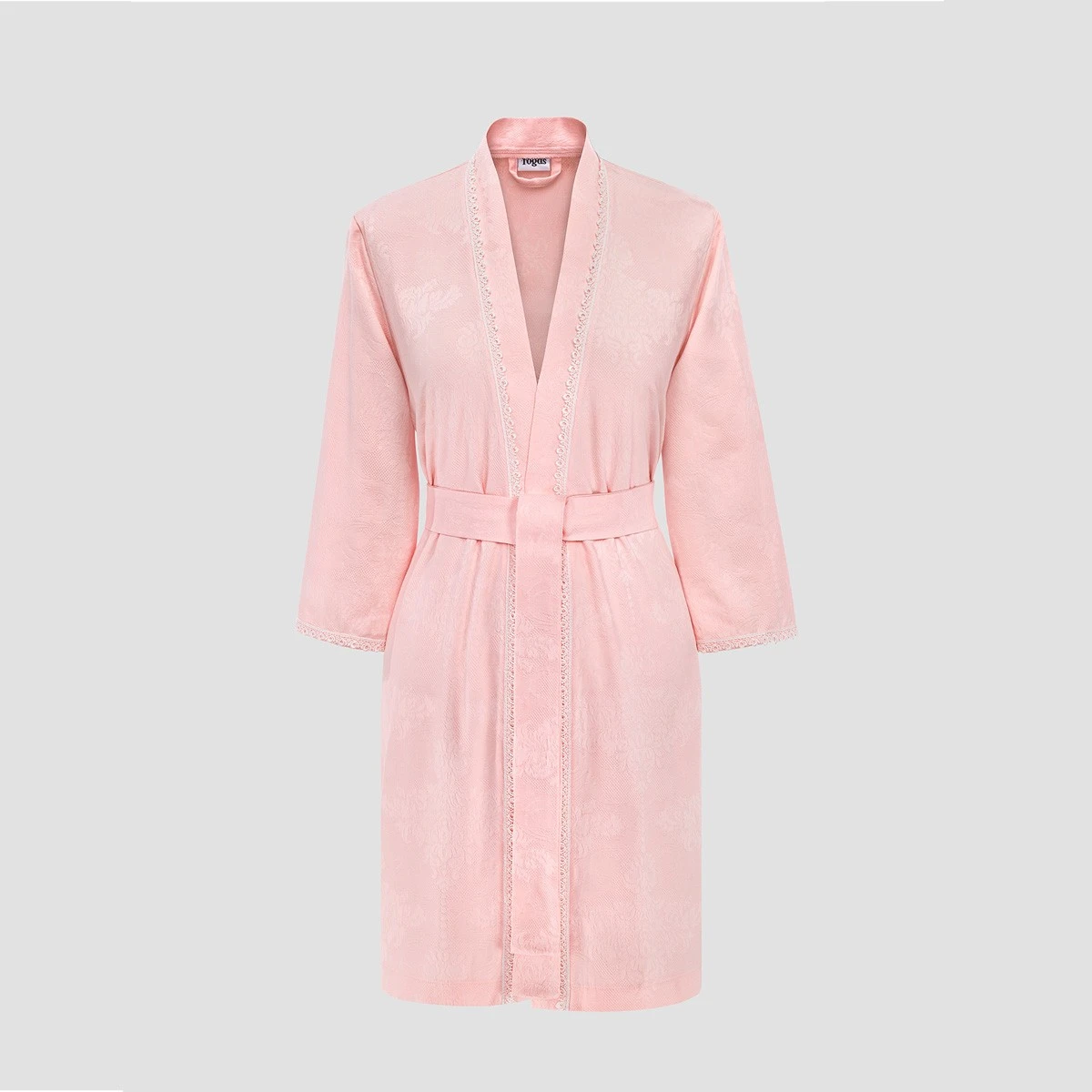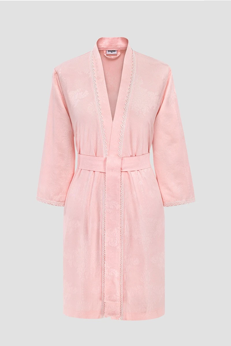 On the textured jacquard fabric ‘Doris’, the classic French Damascus ornament stands out. The robe looks festive thanks to the lace trim that adorns the sleeves, collar and hem of this model. The classic kimono shape with a belt, cropped sleeves, and a comfortable mid-length are a great choice for everyday use.