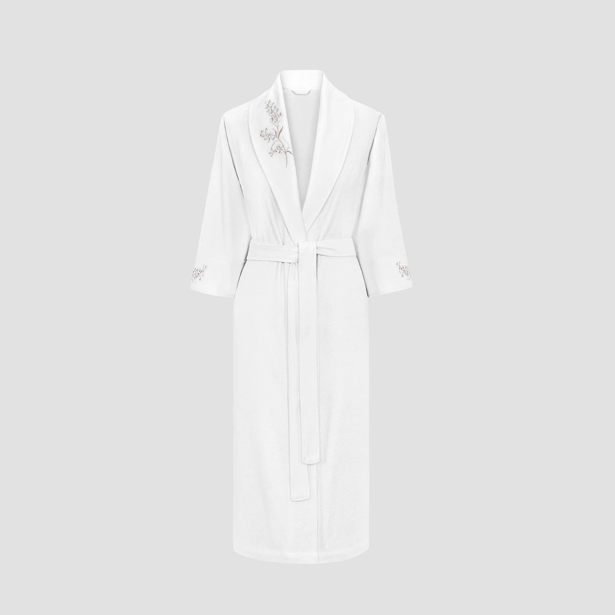 This is a very feminine robe with a shawl collar. A delicate shades perfectly complement the special softness of the fabric. The dressing gown is decorated with graceful embroidery on the collar.