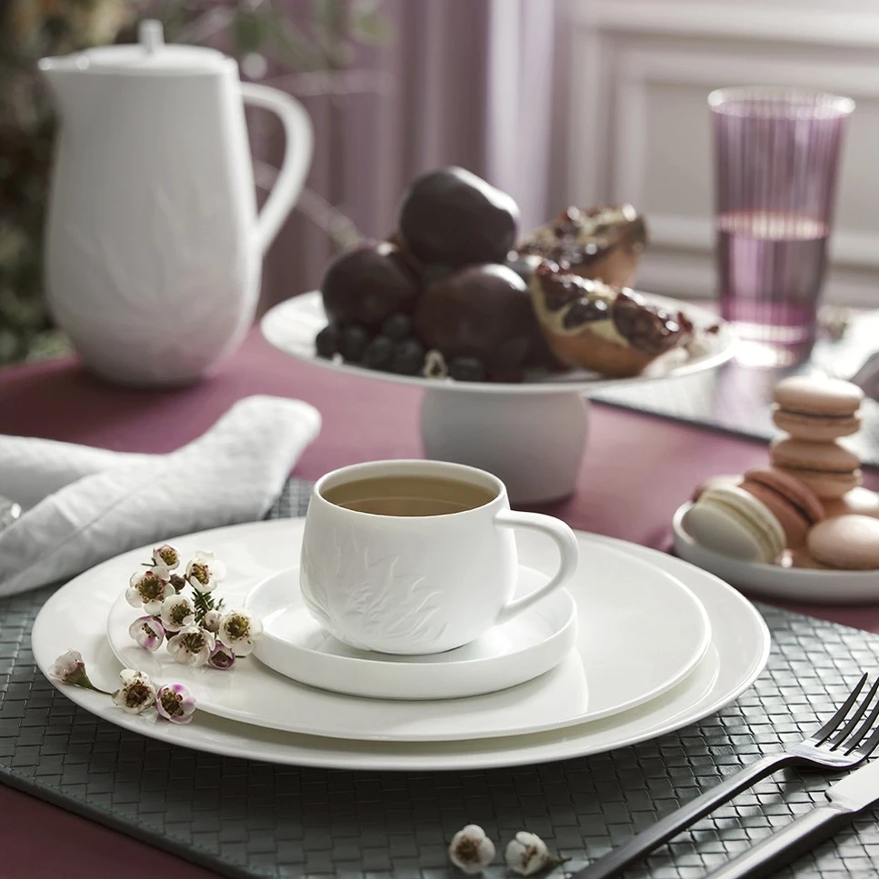 The coffee pair features a matte, velvety exterior with a skillfully crafted lotus flower in relief. The 3D-technique of the flower emphasizes all the lines and curves of its petals. Inside the cup is smoothly enameled. Enameling is the process of applying a thin glass-like cover that additionally protects the porcelain from exposure. The originally shaped saucer with a high rim complements the rounded lines of the cup and combines with the relief petals on its surface.