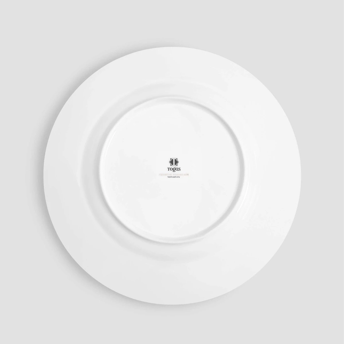 A dinner plate is decorated with a textured classic pattern and a shiny 24 carats gold rim. Such tableware looks exquisite and a gold rim will sparkle beautifully in the evening light. The Baglioni plates set will be a center-piece of any celebration.