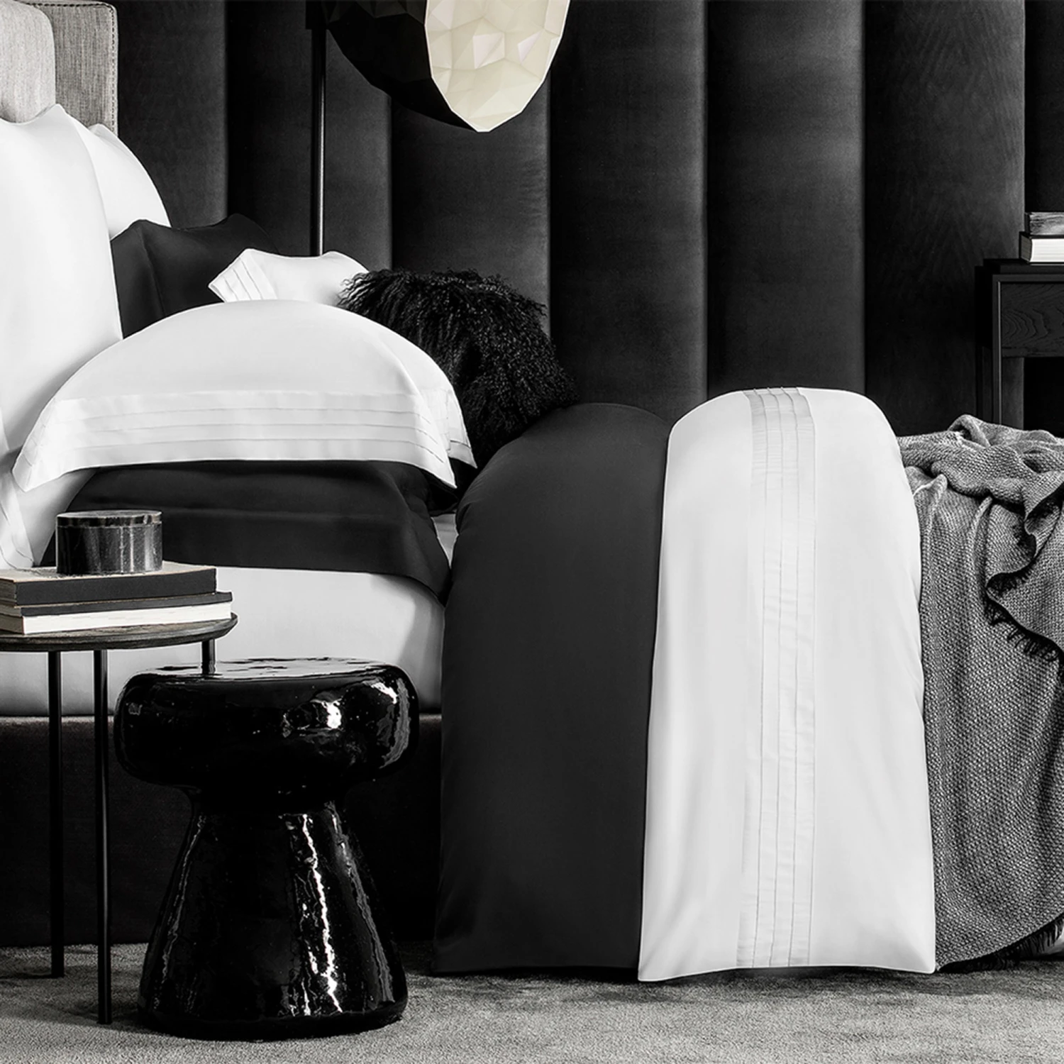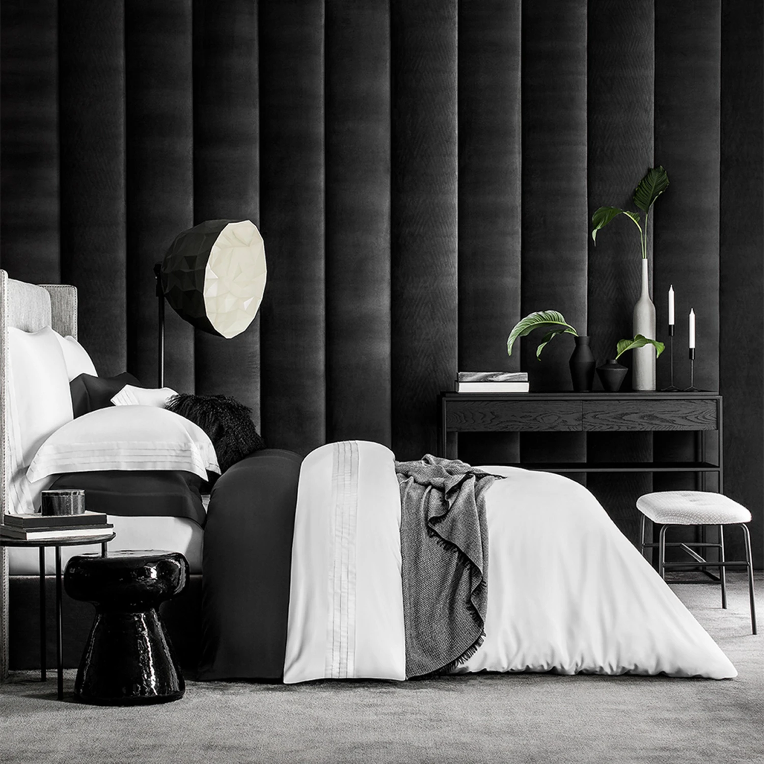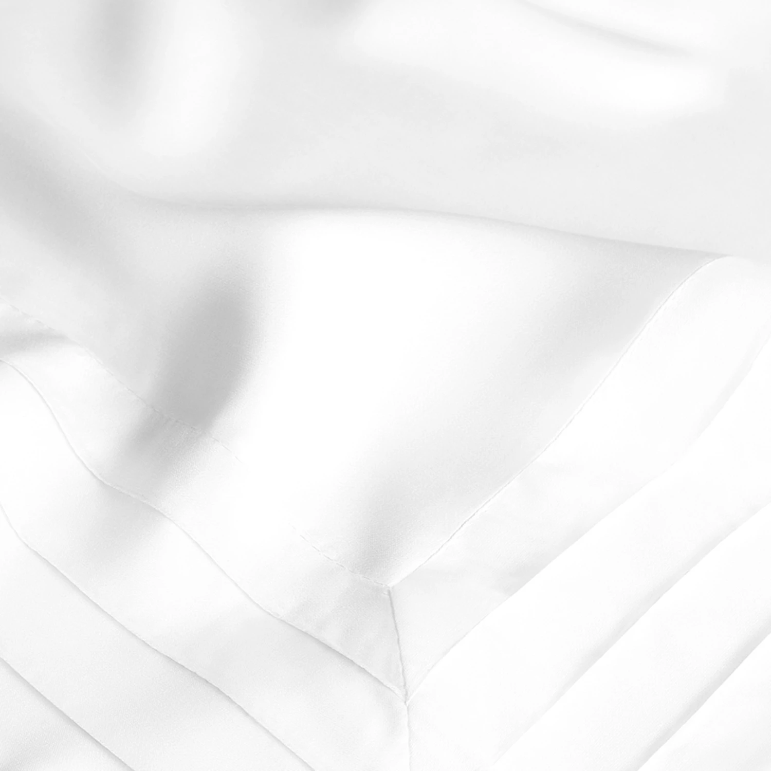 A wide decorative border with a complex finishing stitch adorns the upper part of the duvet cover. Snow-white fabric combined with a silver–gray border is an exquisite European classic in interior design. Plain linen in pastel shades will look perfect in both traditional and modern interiors.