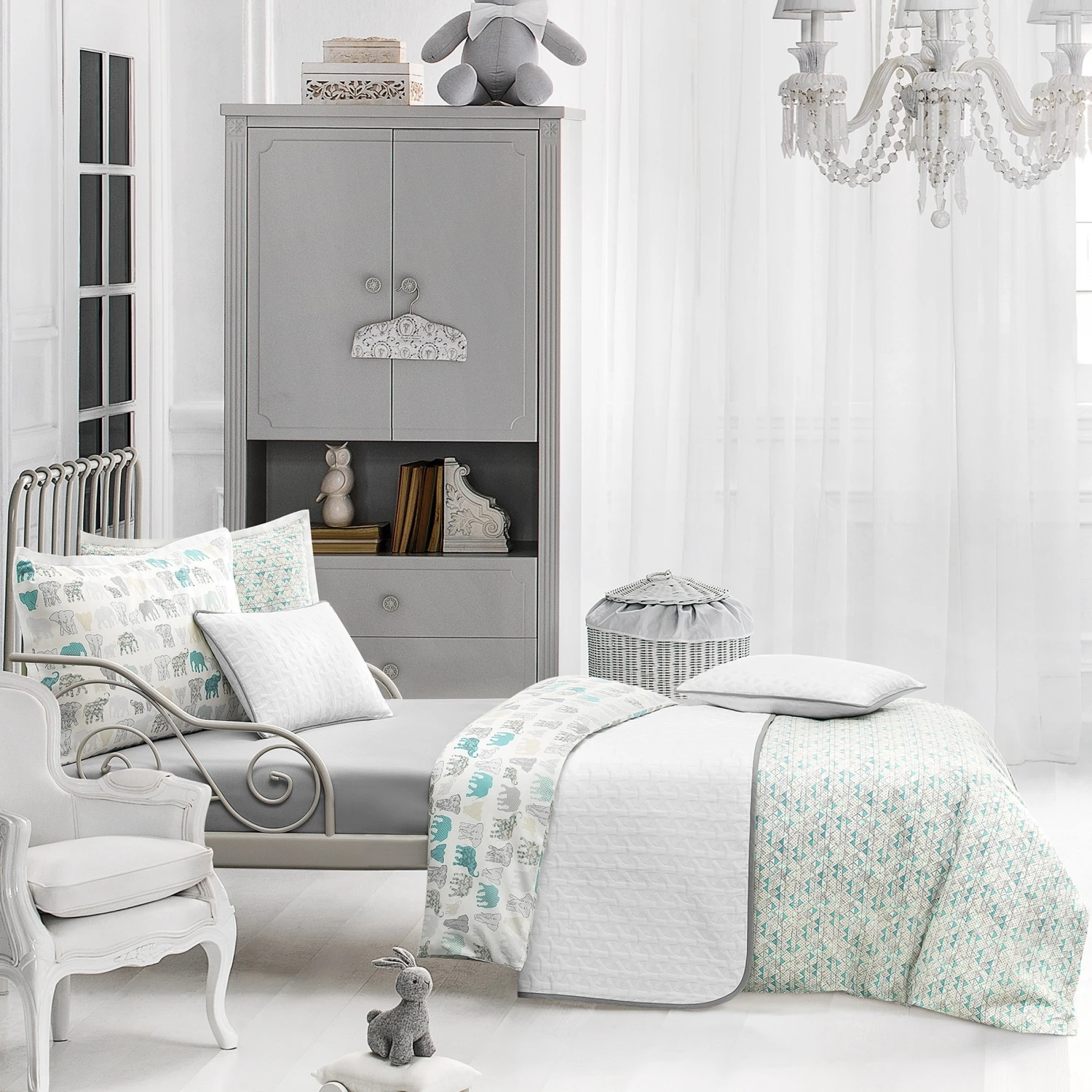 The cold range of colors looks refined and will appeal to those who deny any fussiness and a riot of colors, even in children’s underwear sets. The main course of the ornament is inspired by the famous history of the African elephant Jumbo, who became a circus celebrity. This set is two-sided: one side is decorated with stylized images of elephants, the other – a small geometric print in the same shades. Bed linen is made of cotton-satin, beautiful, soft and pleasant to the touch material with a characteristic silky sheen. Fabric with satin weave threads will not cause trouble in the care, the colors of linen will not fade even after numerous washings.