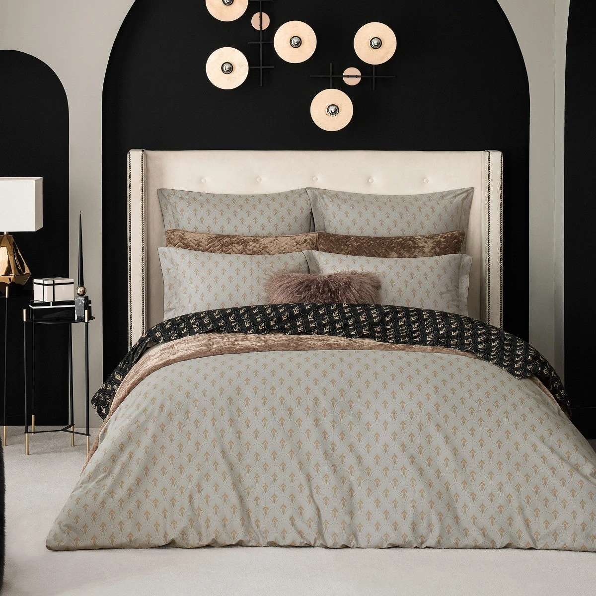 Ornament Ladner is a stylized image of the Egyptian palmette, personifying the rays of the rising sun, one of the most popular Art Deco images. The set is double-sided: the same pattern is repeated on the back side of the pillowcases and duvet cover, but this time on a silvery-grey background of fabric.