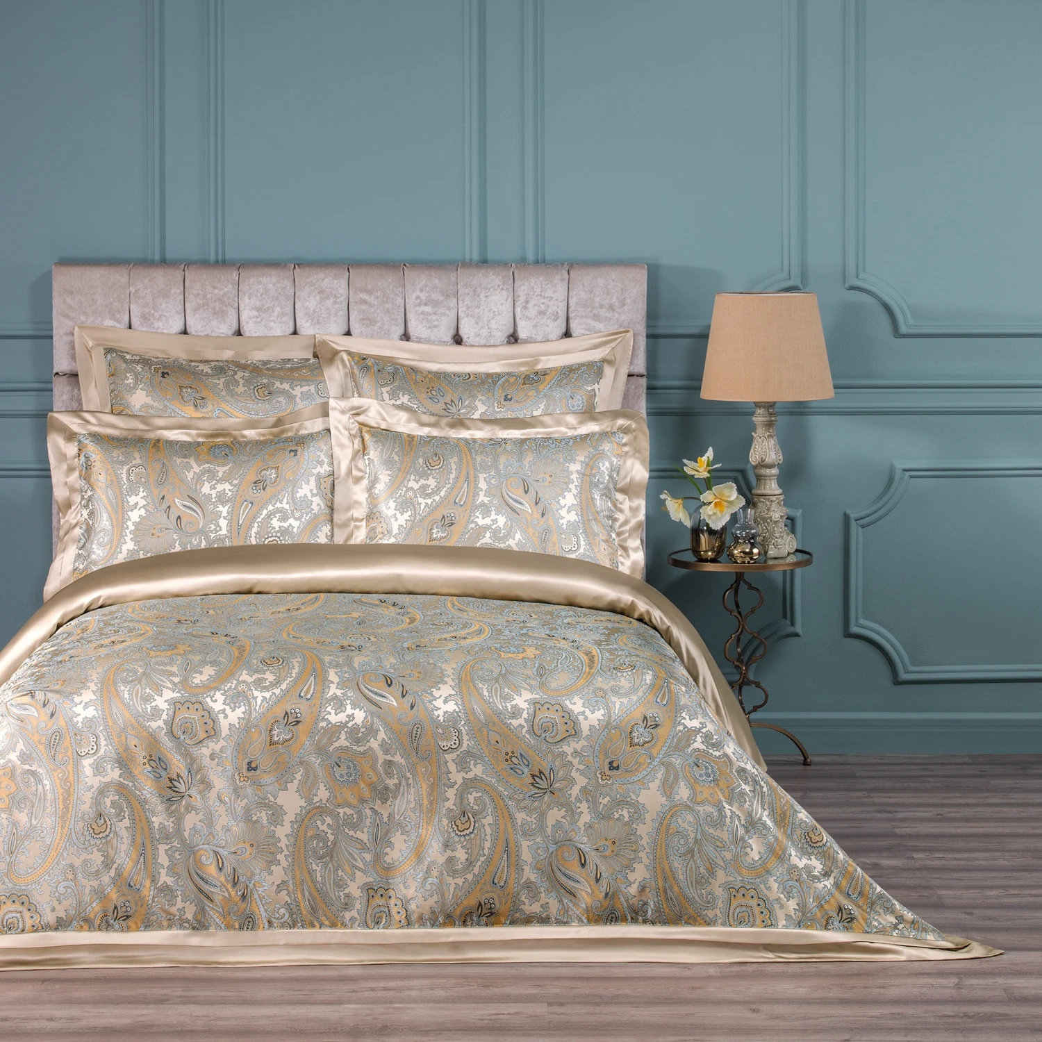 It embodies the luxury and mysterious beauty of the East while its decorative elements are made of smooth, glossy yellow gold silk. Natural silk is the most elegant and expensive material for bedding accessories and has a distinctive softness, gentleness, and the ability to regulate body temperature to keep you comfortable. In summer it has a cooling effect, while in winter – keeps your body warm.
