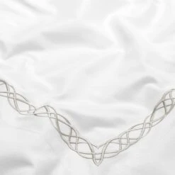 This set combines two different textures. Smooth satin is complemented by a companion material with a jacquard pattern on the front of the duvet cover. A discreet geometric ornament of pistachio color attracts attention with a noble relief created on a jacquard loom. The Maestro pillowcases are framed by wide decorative borders with the same geometric elements. An elegant set ‘Maestro’ will decorate any bedroom, this is a premium class bedding.