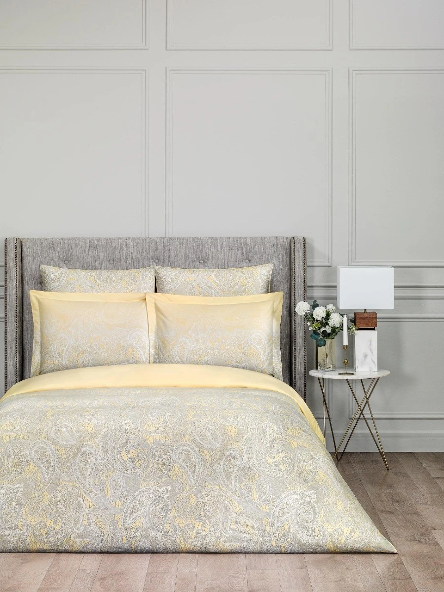 Against the soft light yellow background of the fabric ‘Margaret’ stands out the Eastern pattern of Paisley ash-gray shade. The elegant, finely drawn lines of this classic ornament resemble silver-pearl French lace, which is embroidered on the fabric of the duvet cover and pillowcases. The reverse side of the duvet cover is plain, which allows you to change the design of bed linen and the situation in the bedroom, depending on the mood.