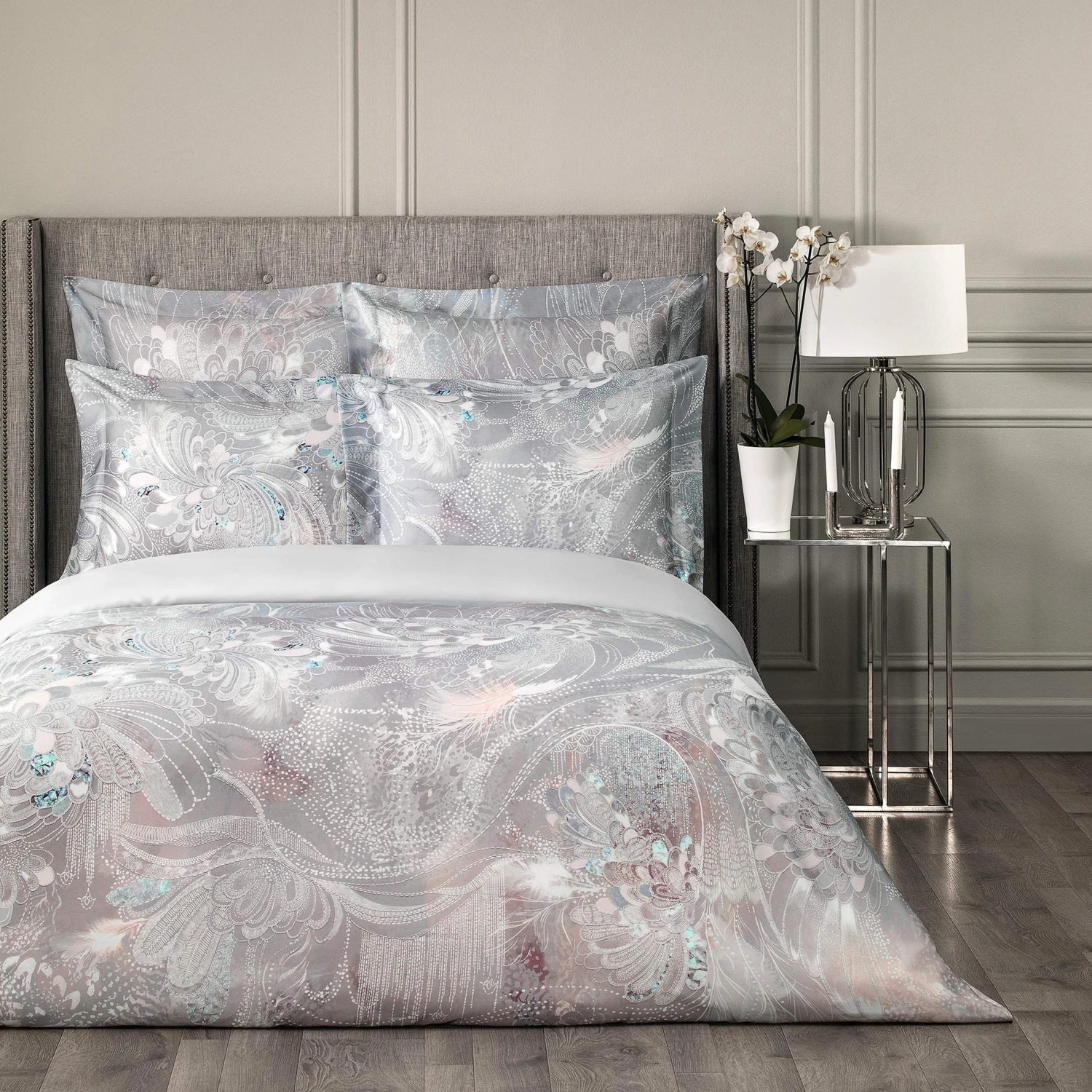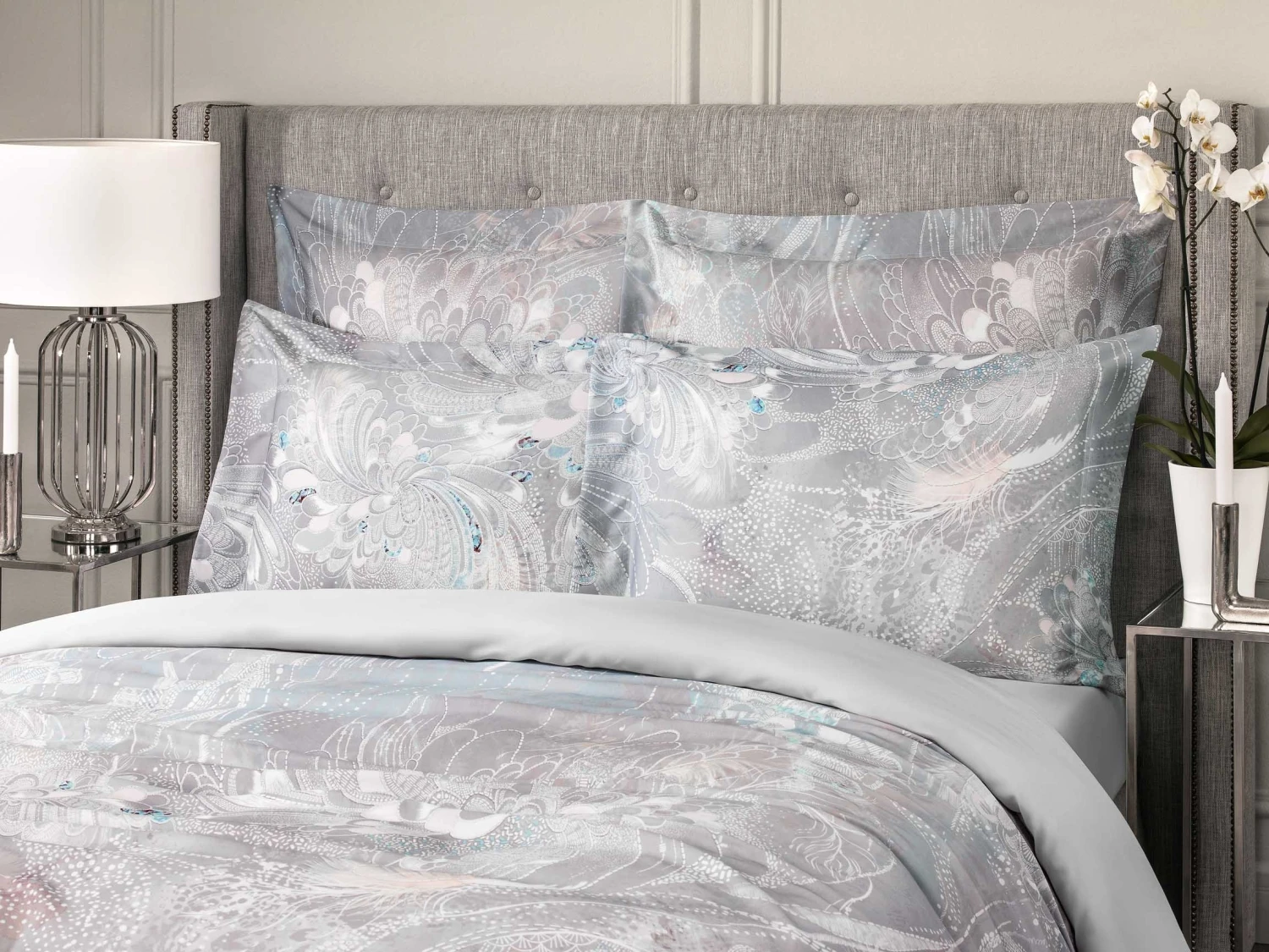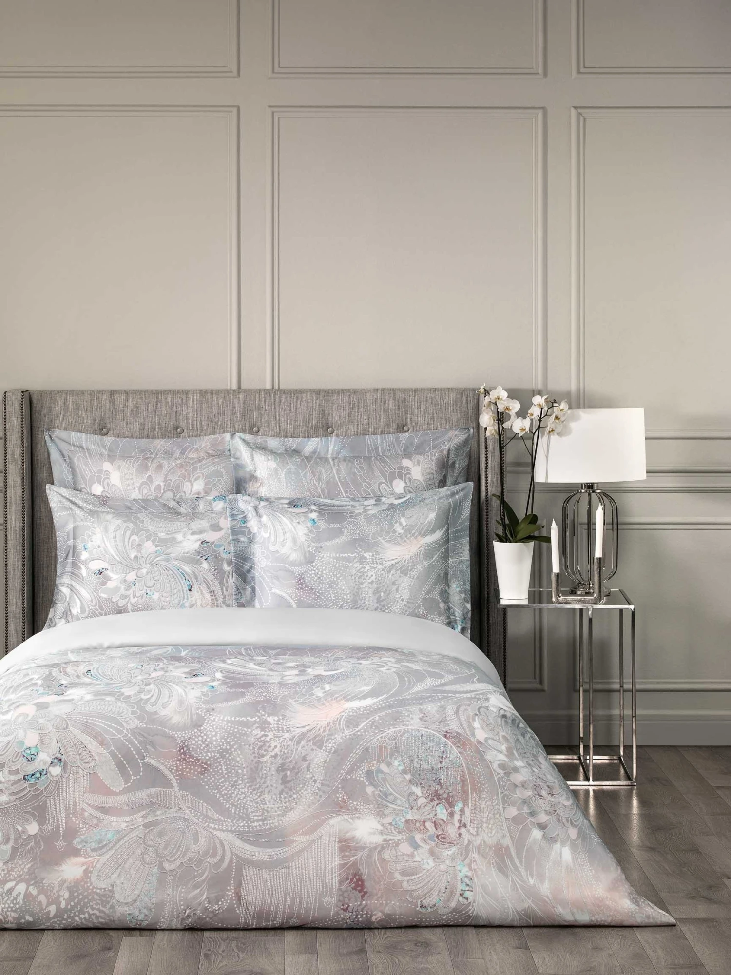The set ‘Perla’ reflects a palette of pearl shades – from shining iridescent mother-of-pearl to rare tones of silver and pink pearls. The unusual pattern of this bed linen seems to have come from dreams. The beautiful plumage of mysterious birds, unusual lines of fabulous flowers, the radiance of the edges of precious stones – all this seems to be mixed in a misty haze of dreams.
