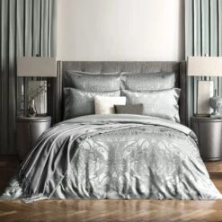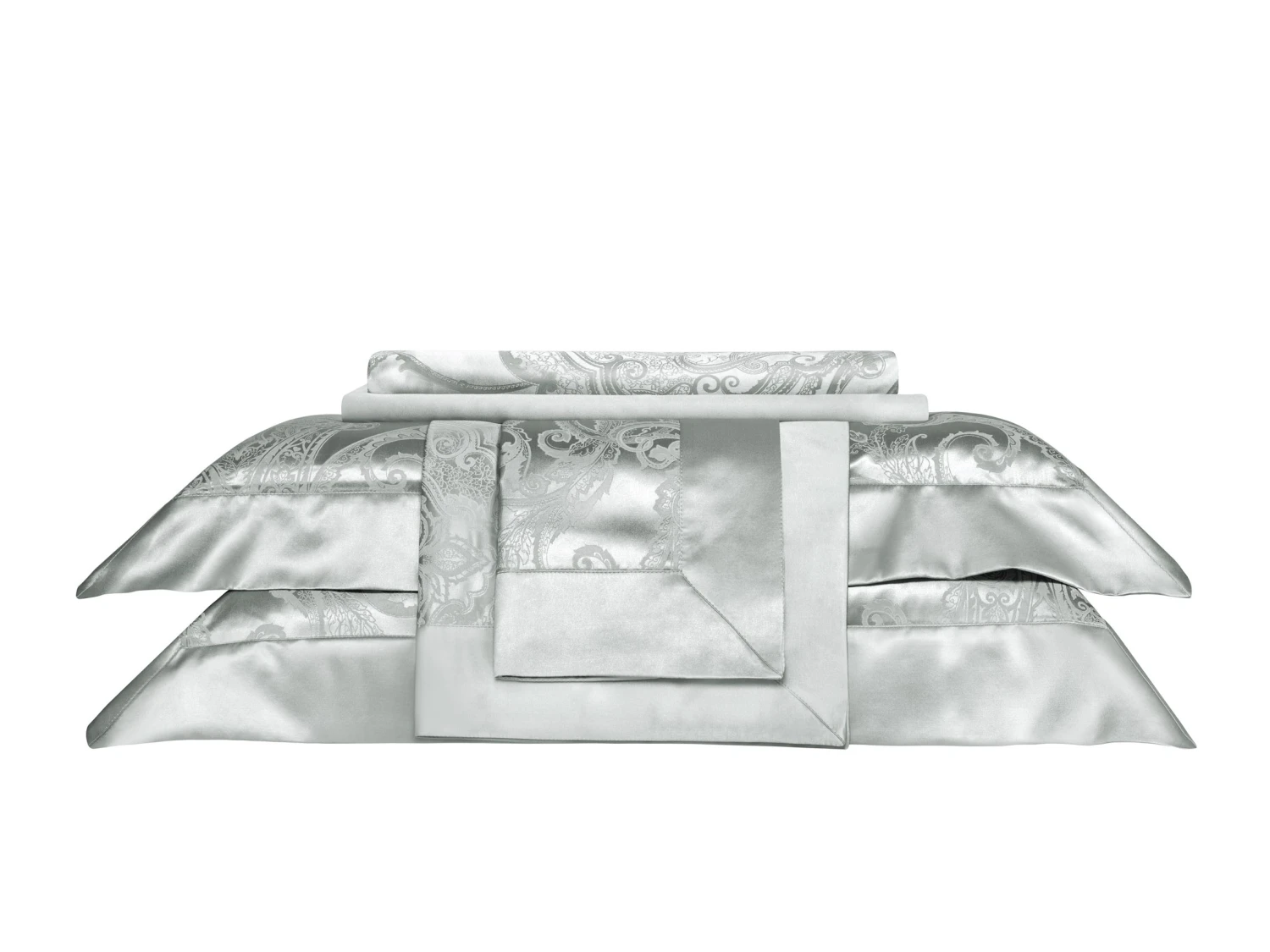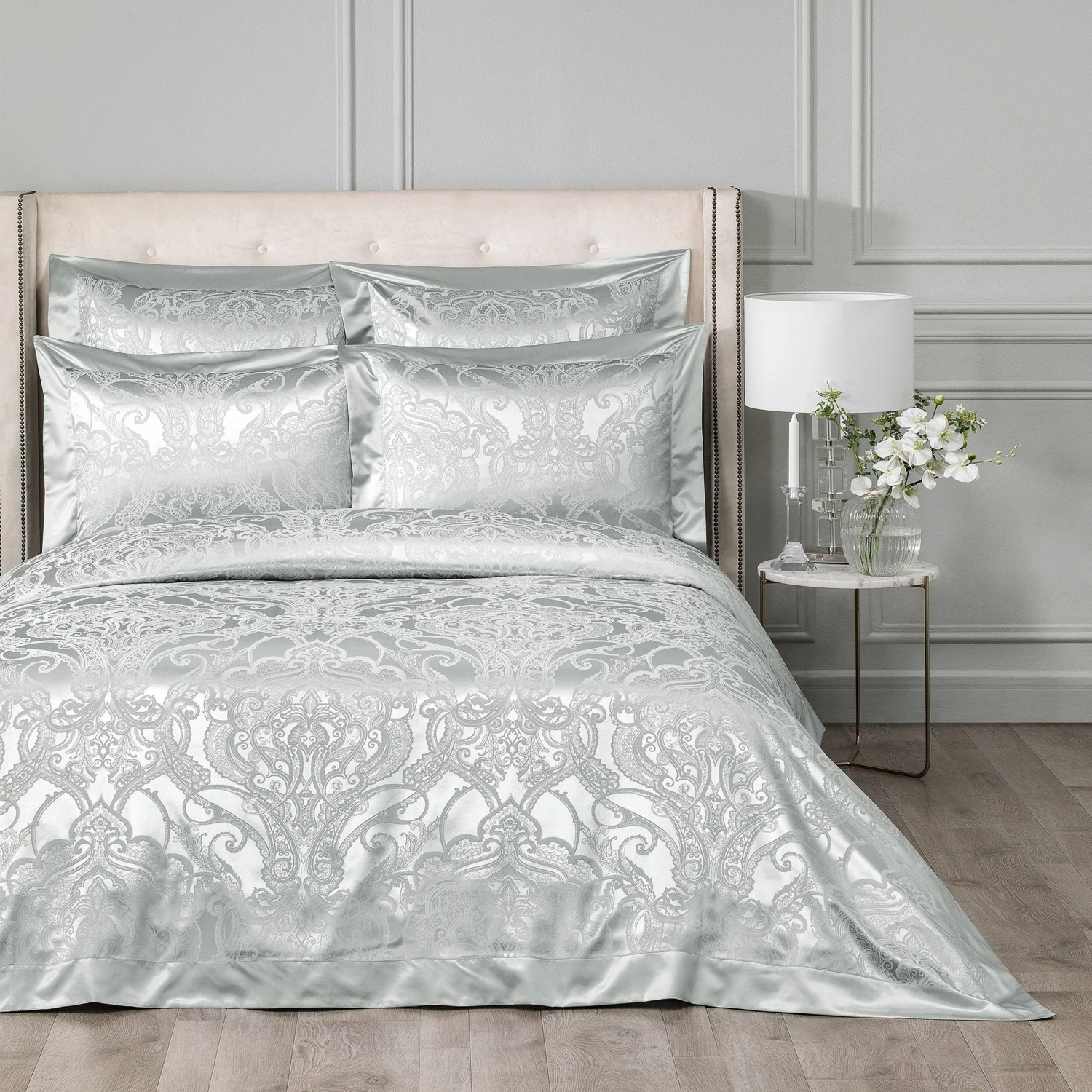 The complex weaving of the pattern is stylized leaves and flowers. It is the famous arabesque pattern, complemented by elements of the Venetian style. The fine texture of the jacquard fabric and the elegance of the ornament emphasizes the smooth, satin border of pillowcases and duvet cover.