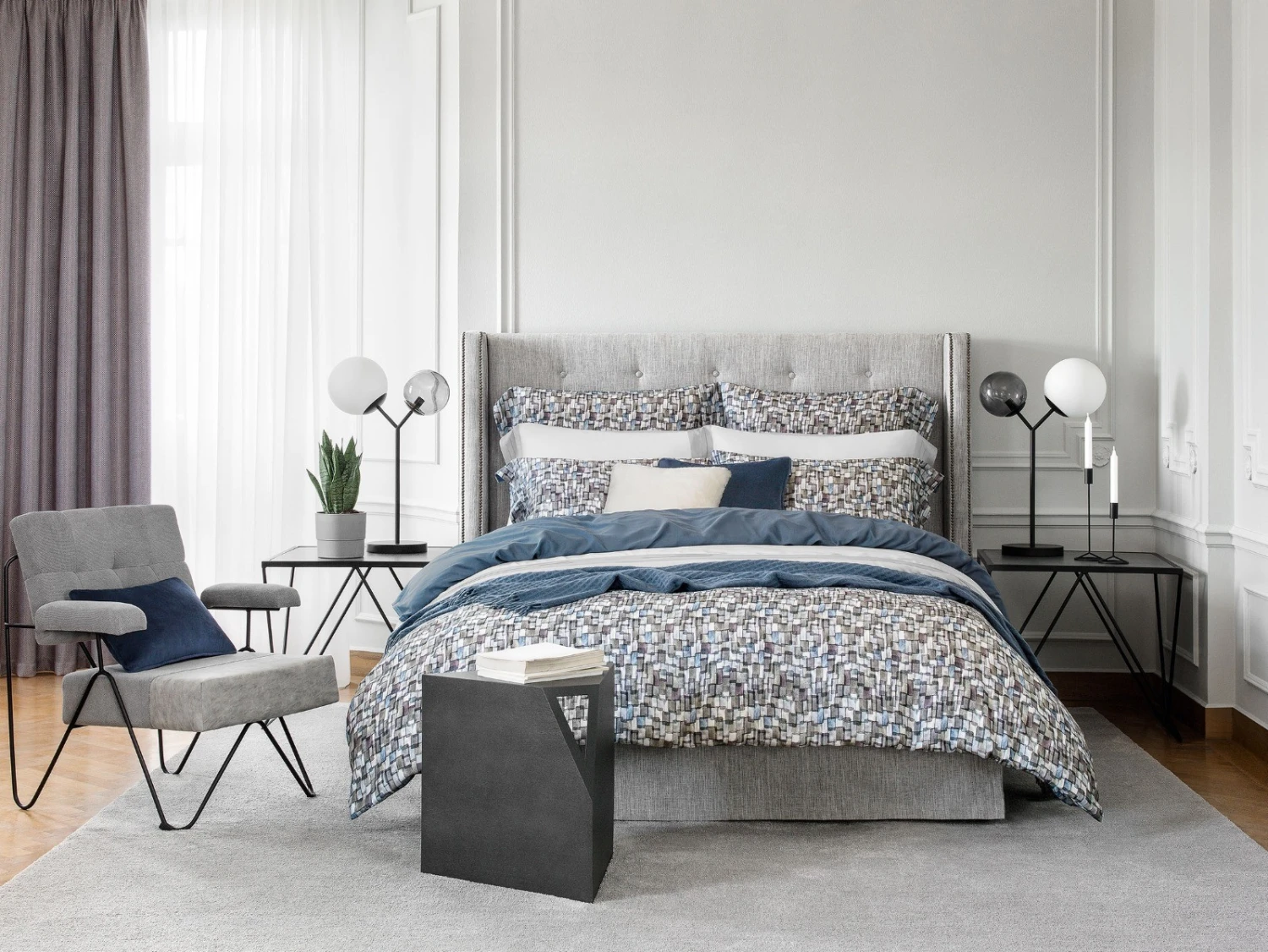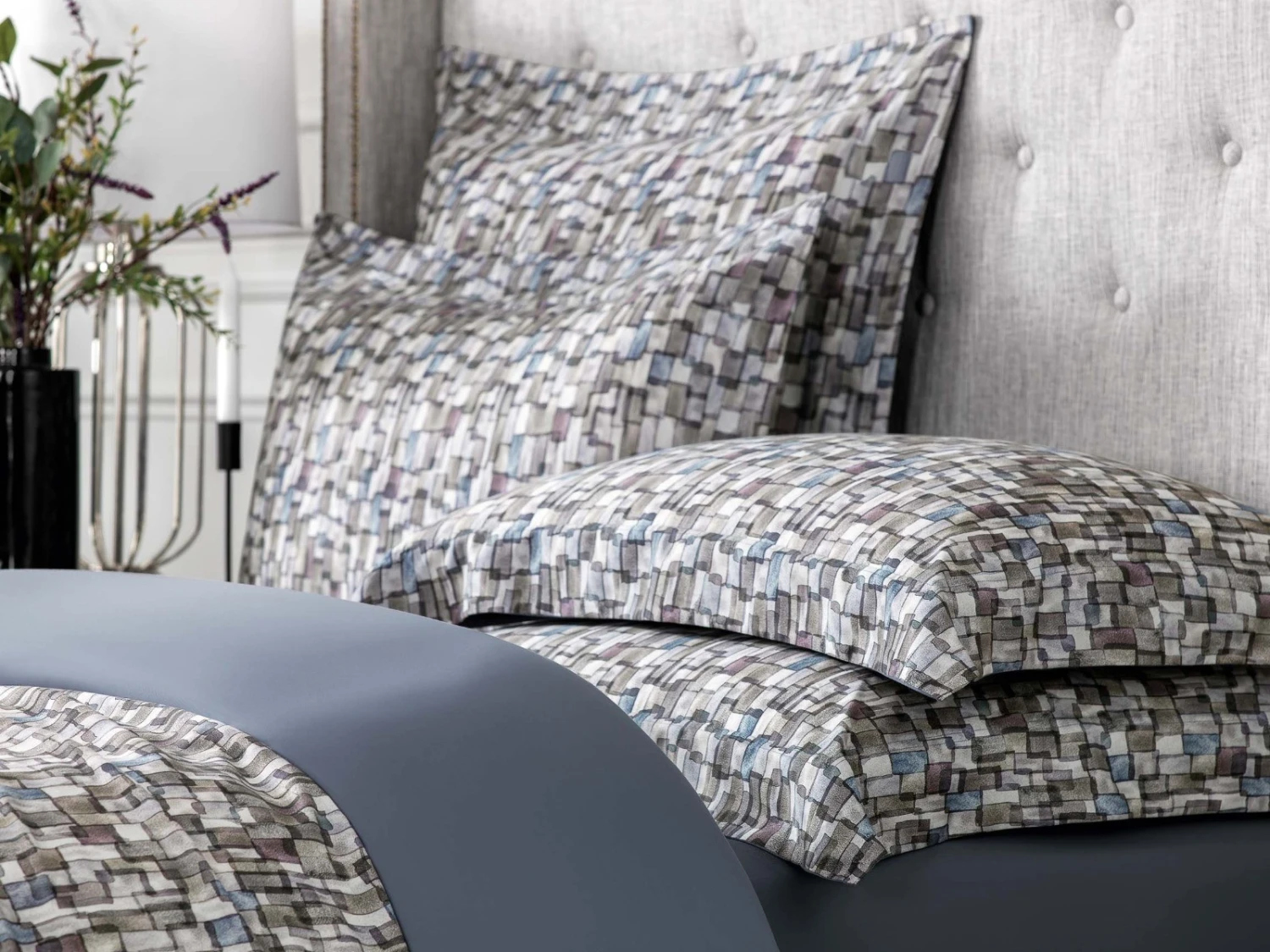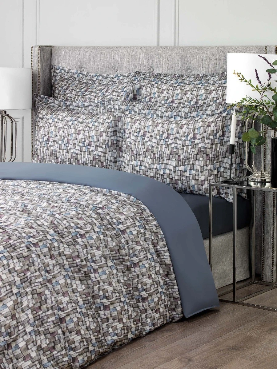 Gilbert bed linen is made in a restrained color palette. The set is decorated with an original print in watercolor technique with its characteristic blurring of contours. Mixing different colors of paint on the fabric creates a beautiful iridescence. The range of these color highlights is very deep, with complex combinations of shades from blue to green, from gold to wine, as if the colored glass pieces of a kaleidoscope were scattered. The noble steel-blue color of the sheet and the back of the duvet cover is the background that sets off the mosaic pattern.