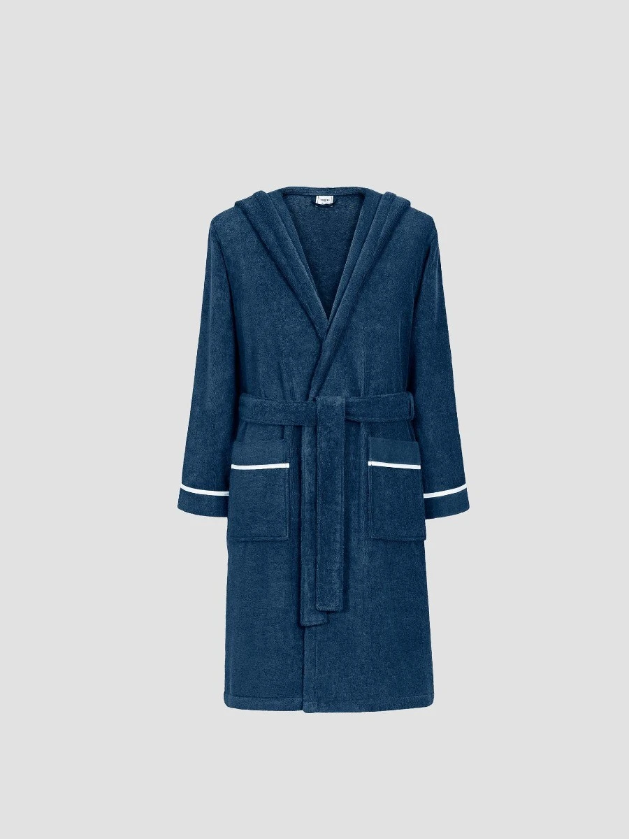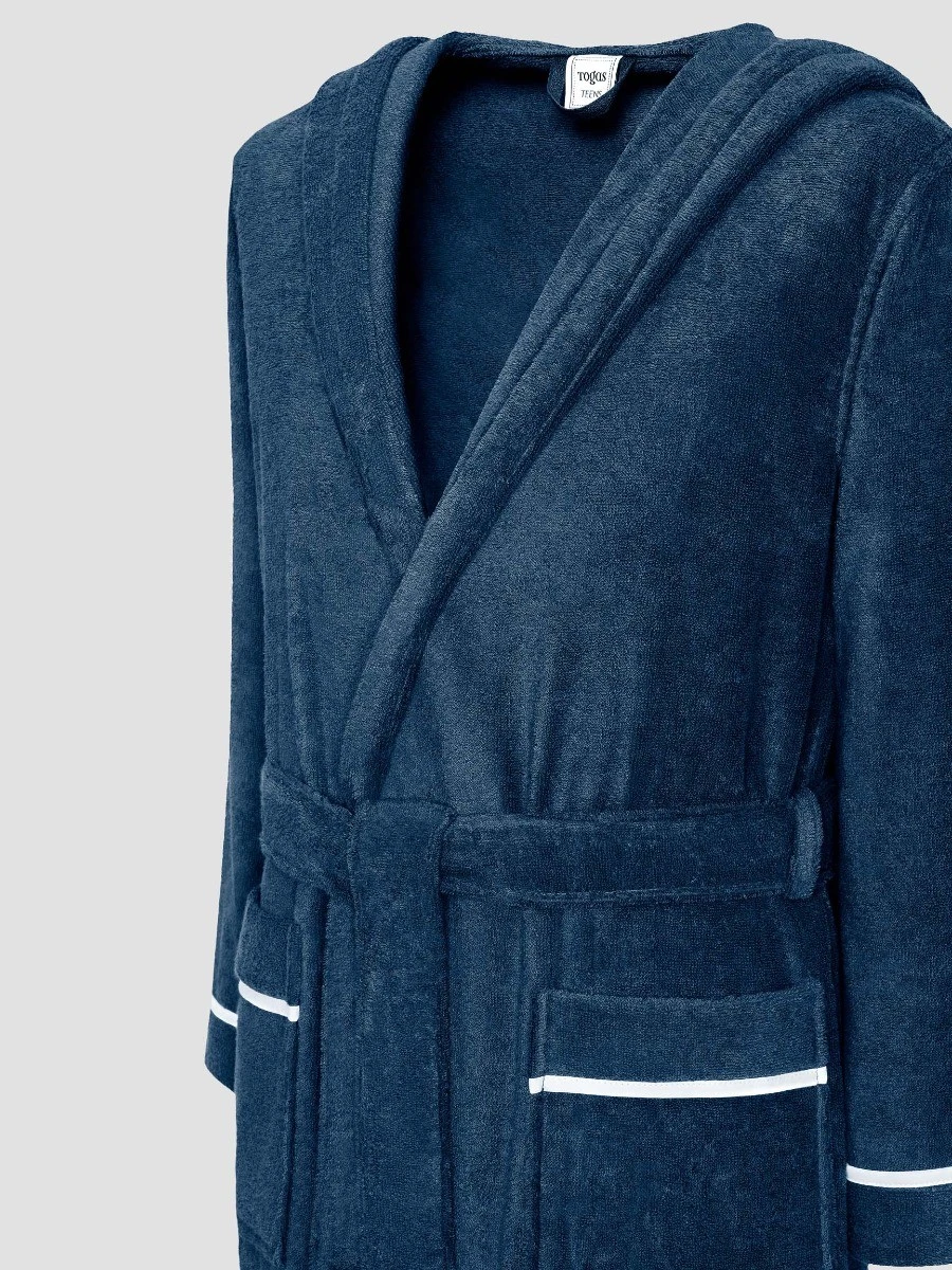 A comfortable robe with a hood and patch pockets will appeal to teenagers for its restraint, beautiful color and ‘adult’ design. The navy blue of this model is a classic color for boys and one of the trends in the palette of home textiles. The pockets and cuffs of the robe are decorated with contrasting white piping that emphasizes the depth of the blue.