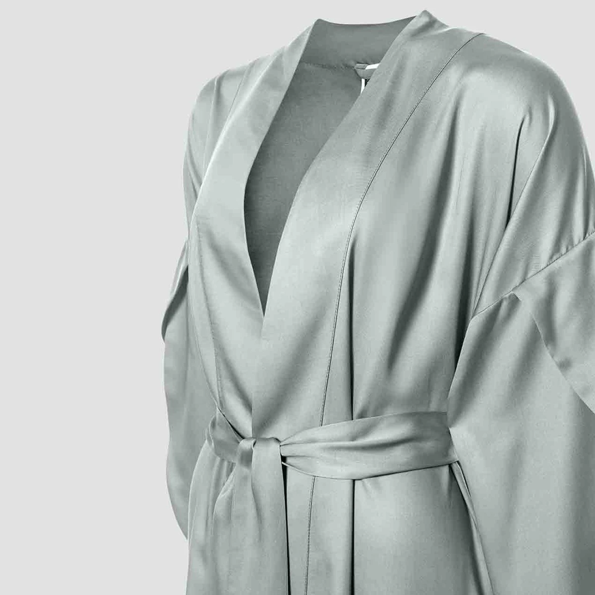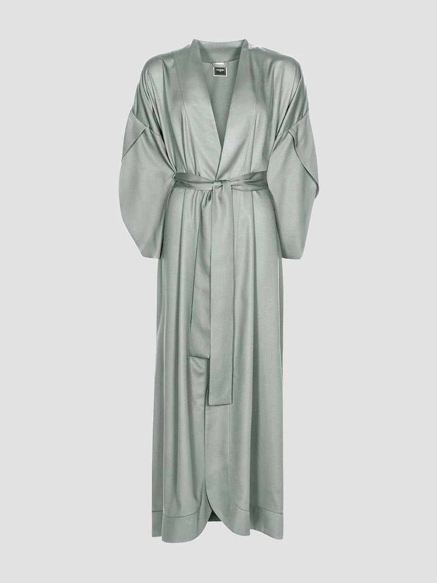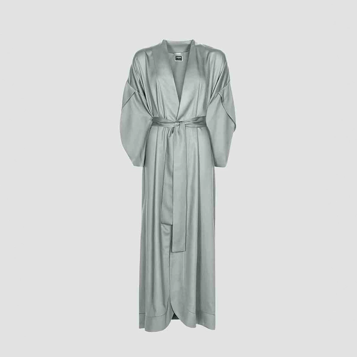 Naomi is a classic thin robe that falls in flowing folds and looks feminine. The gorgeous grey and the sheen of the fabric represent the exquisiteness of iridescent silver pearls.