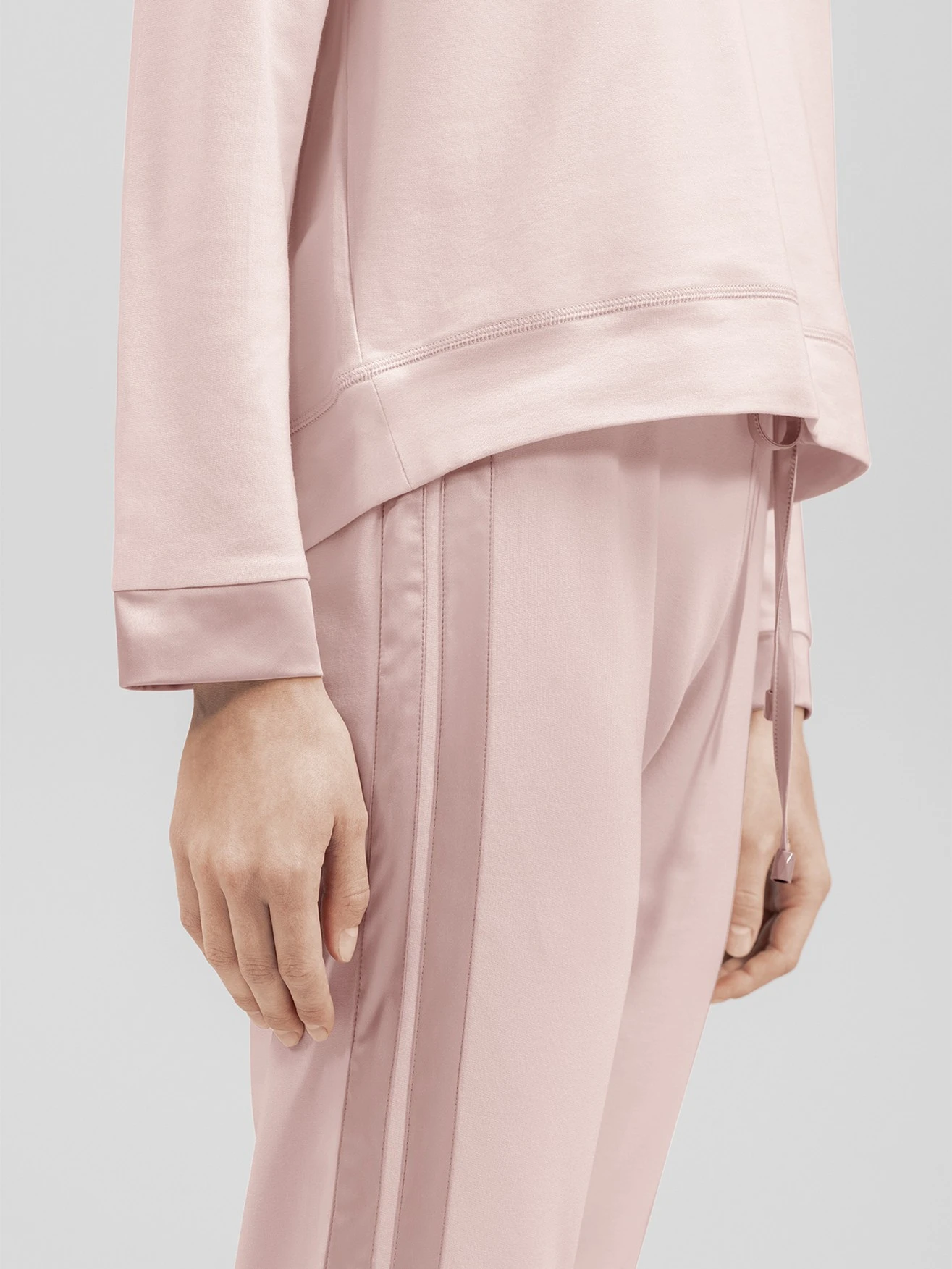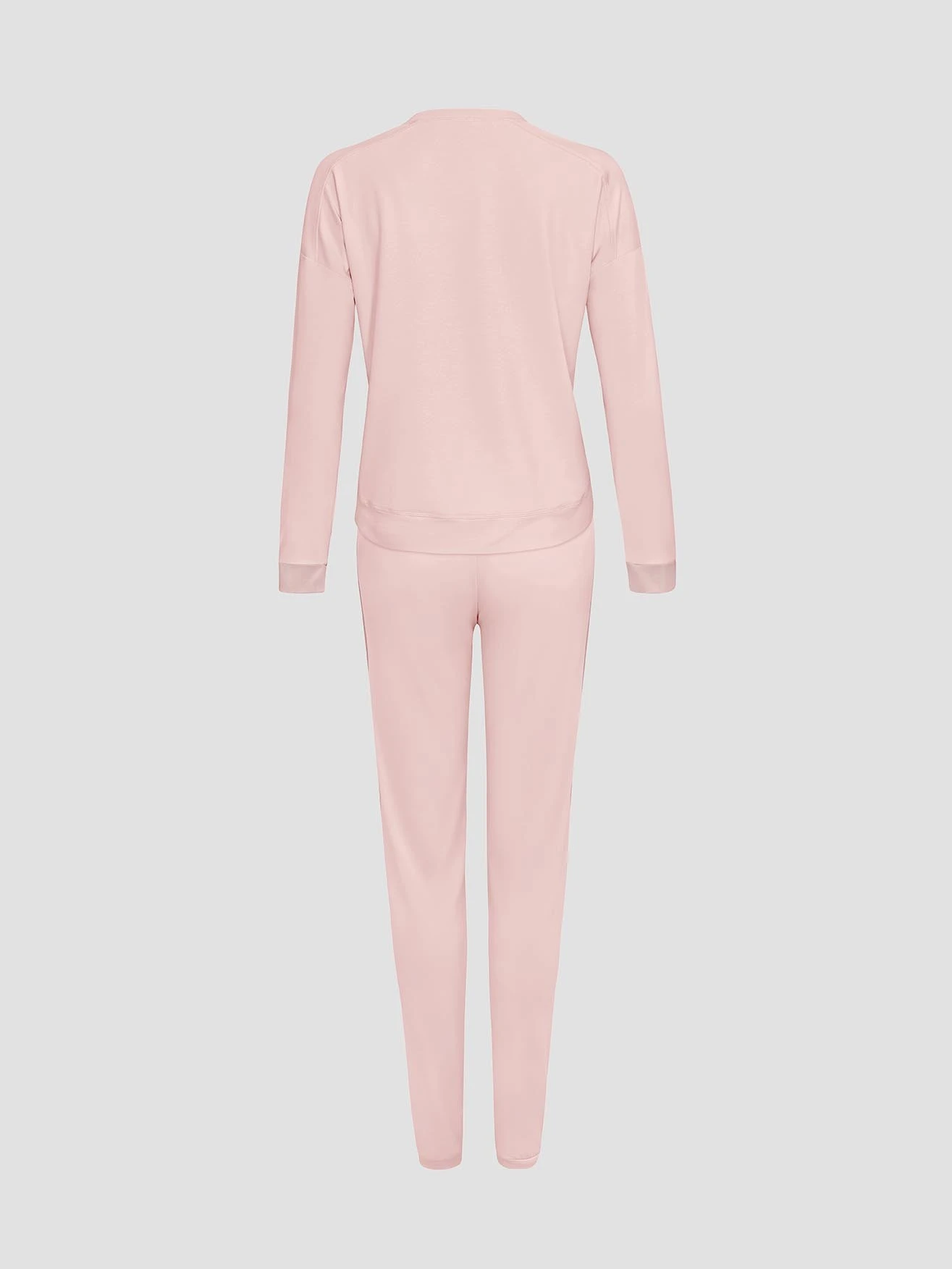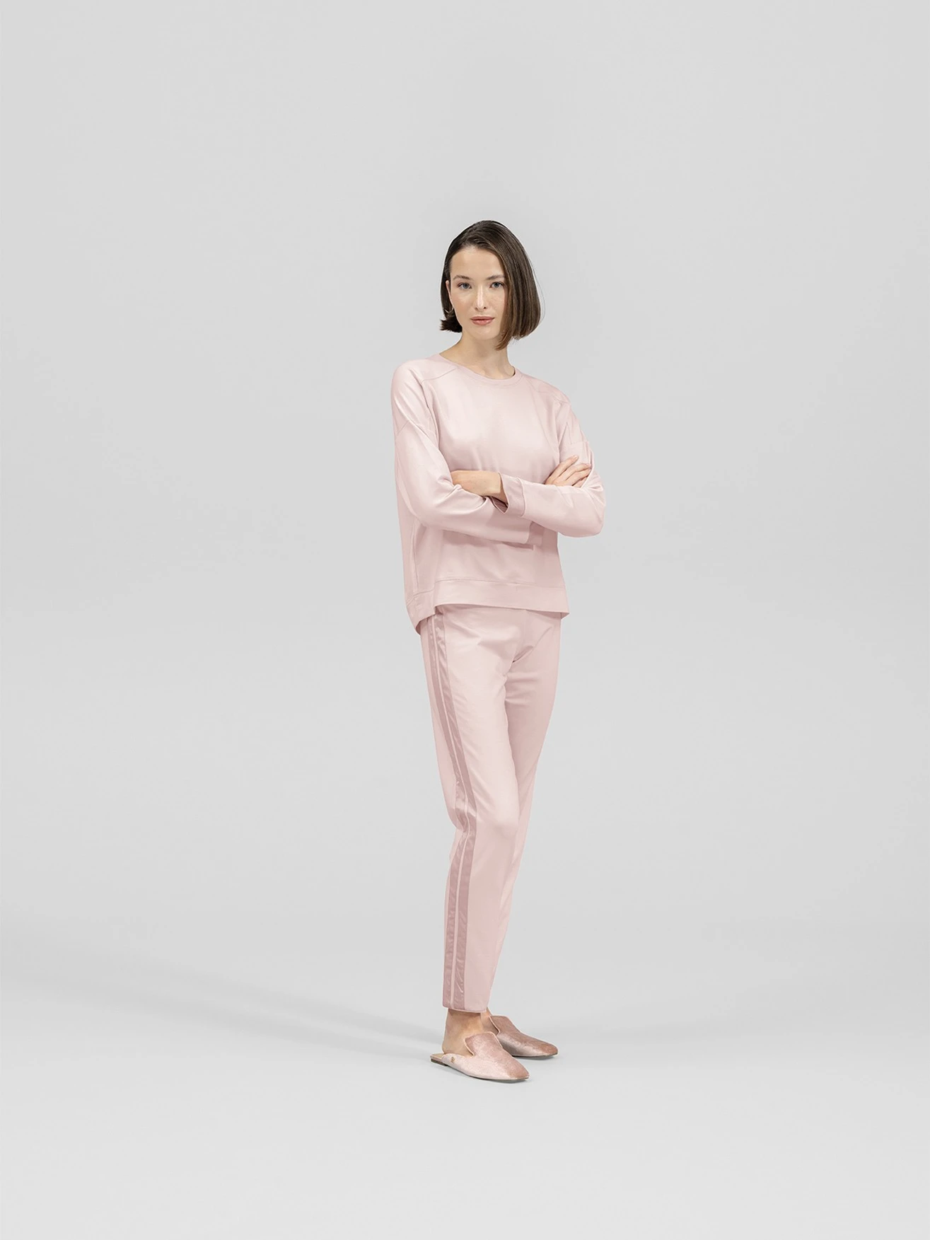 This delicate model of pink color accentuates the body. Long-sleeve cropped pullover is decorated with satin cuffs. The trousers are decorated with satin stripes on the sides, the same satin cuffs comfortably wrap around an ankle.
