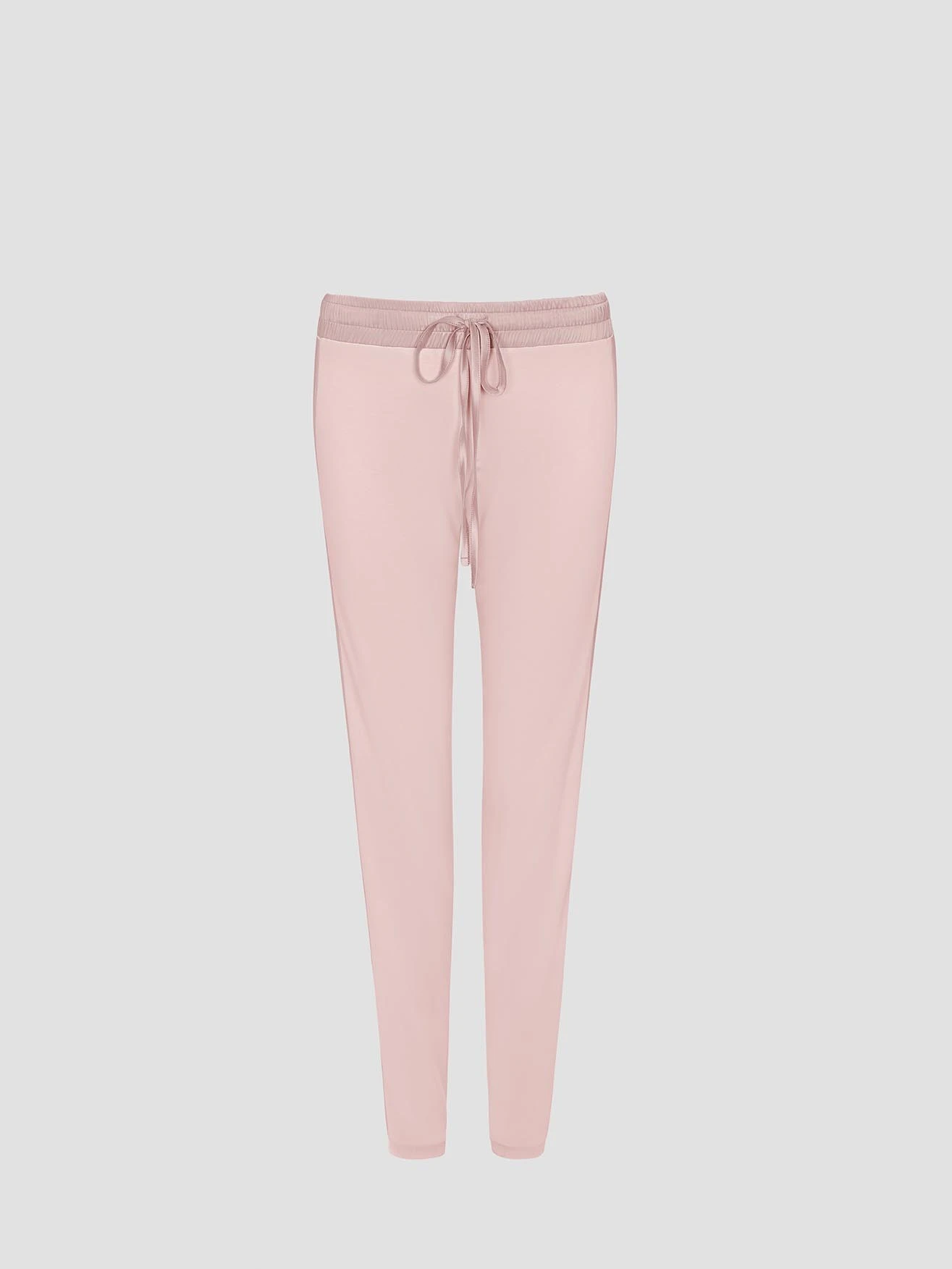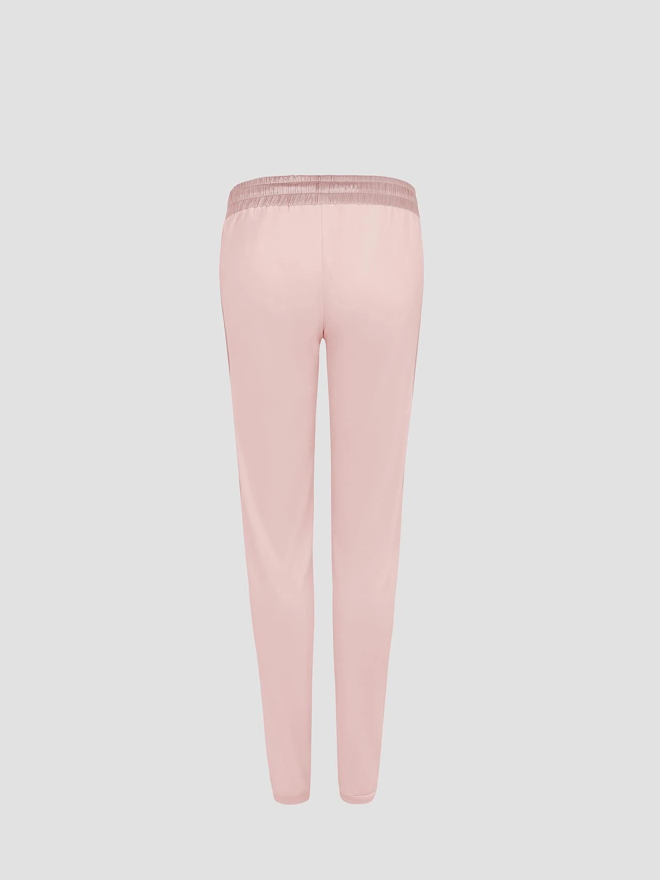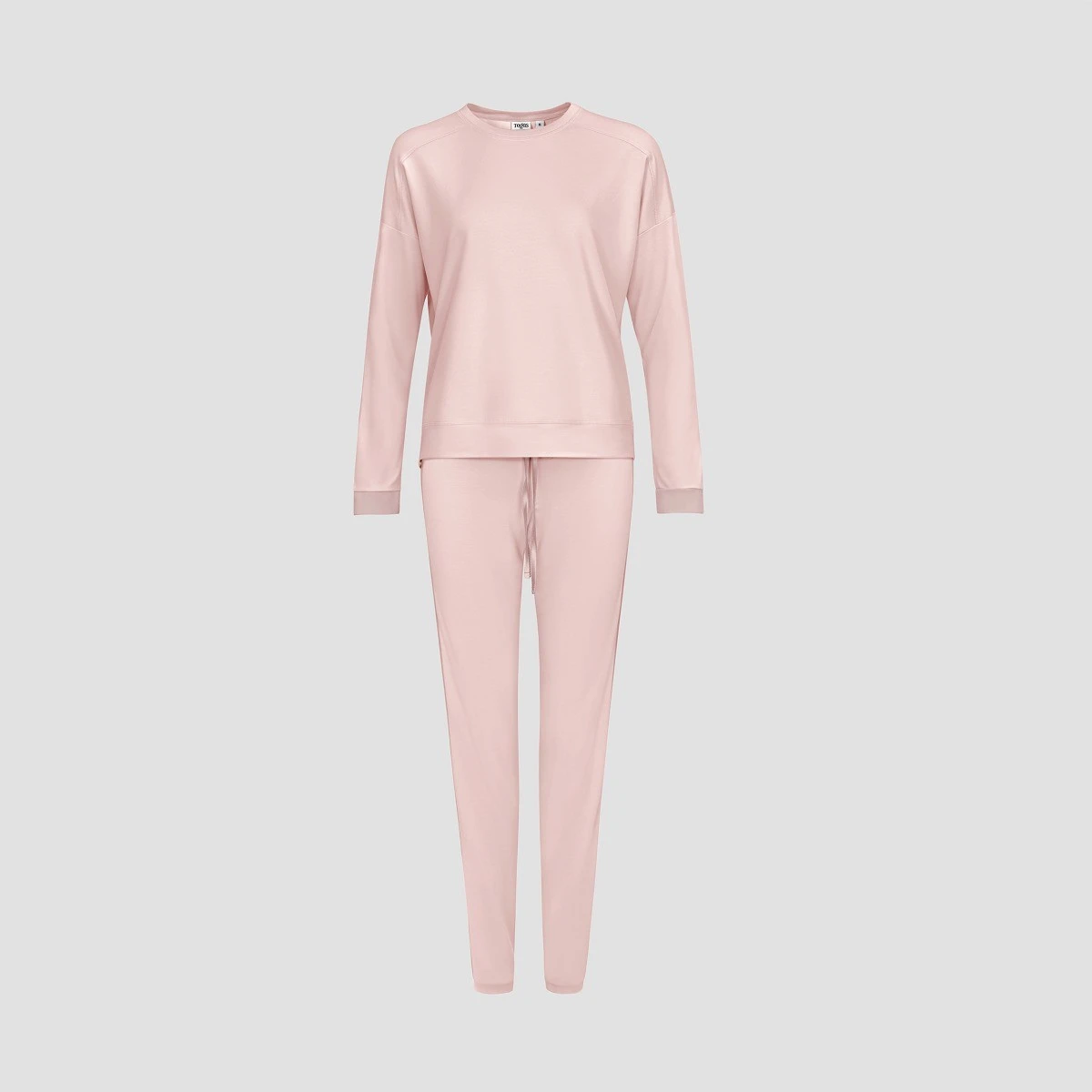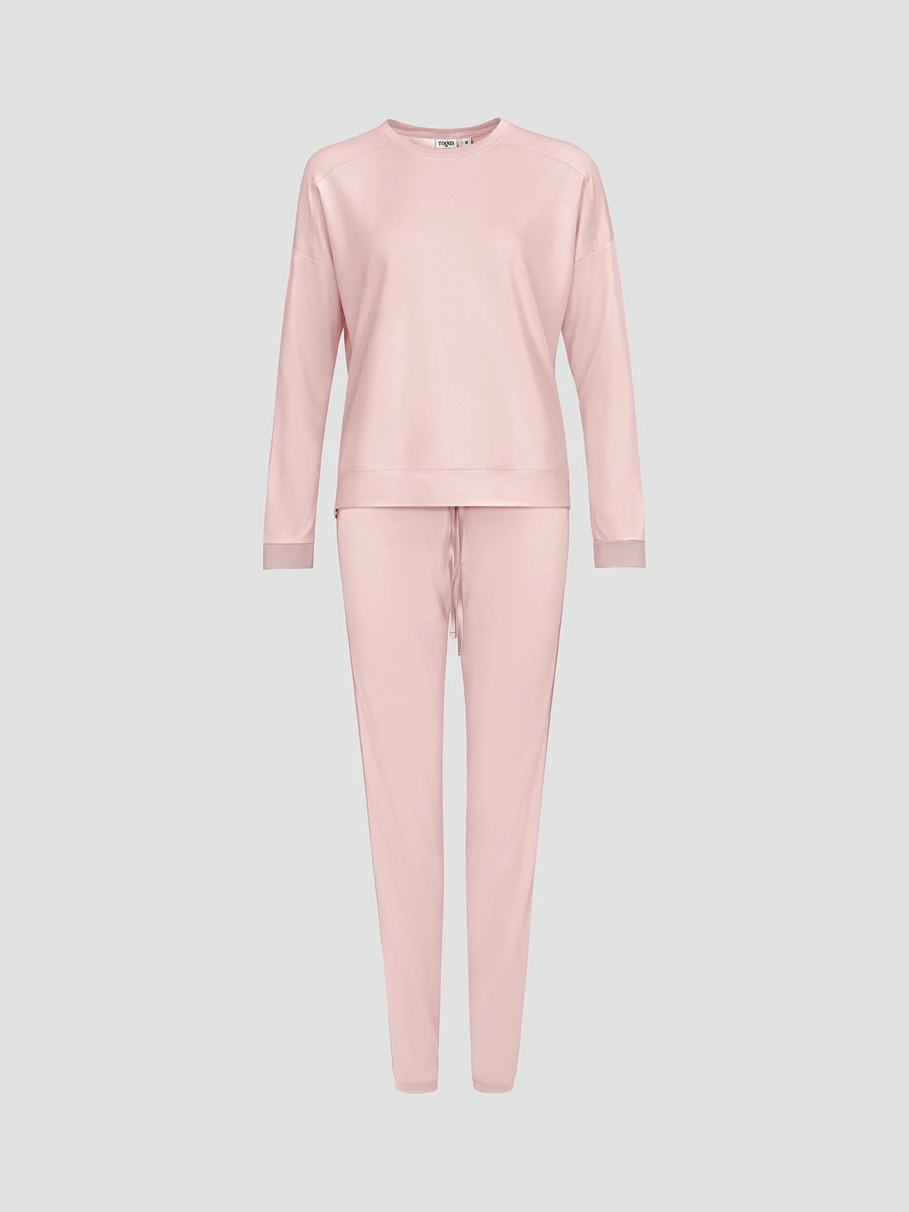 This delicate model of pink color accentuates the body. Long-sleeve cropped pullover is decorated with satin cuffs. The trousers are decorated with satin stripes on the sides, the same satin cuffs comfortably wrap around an ankle.
