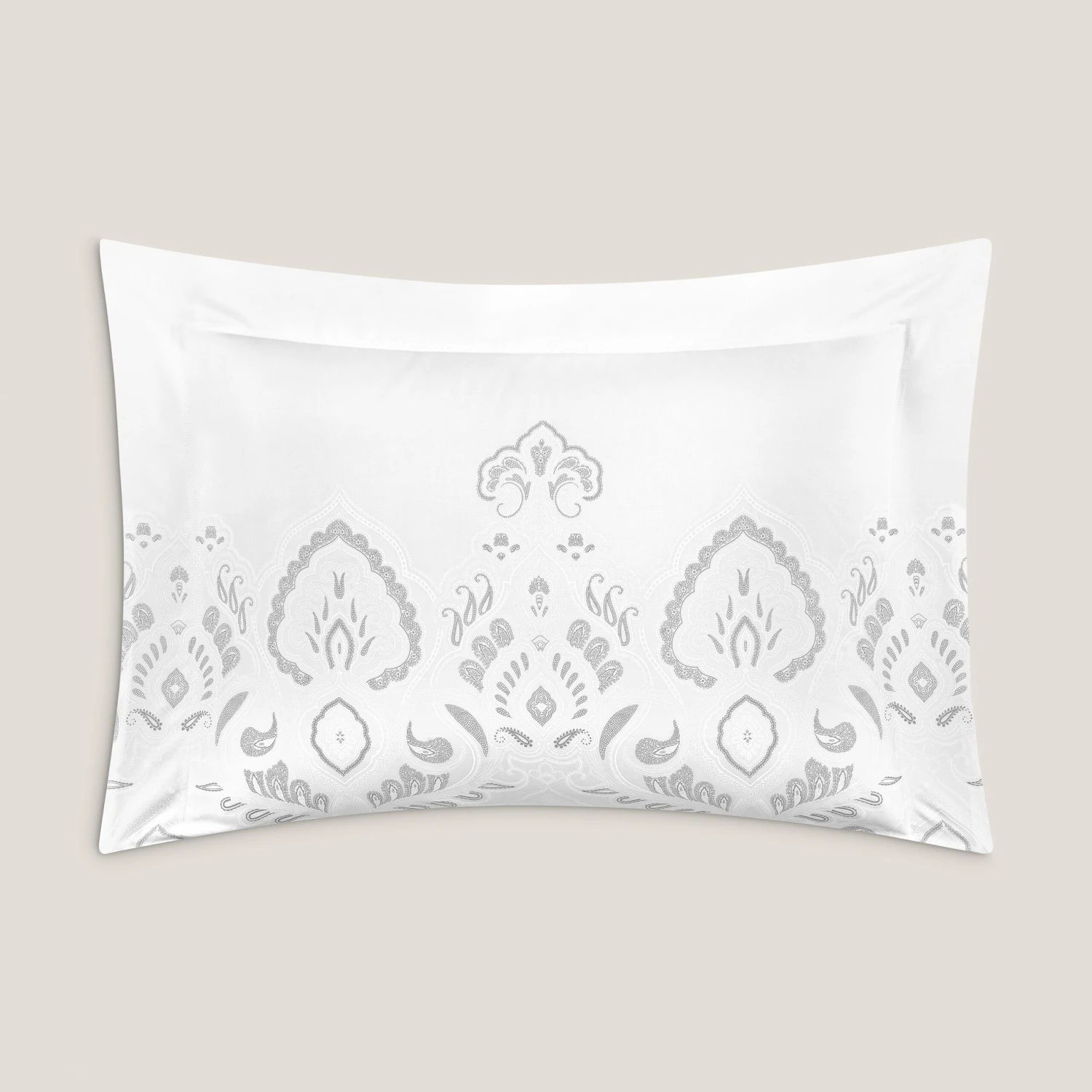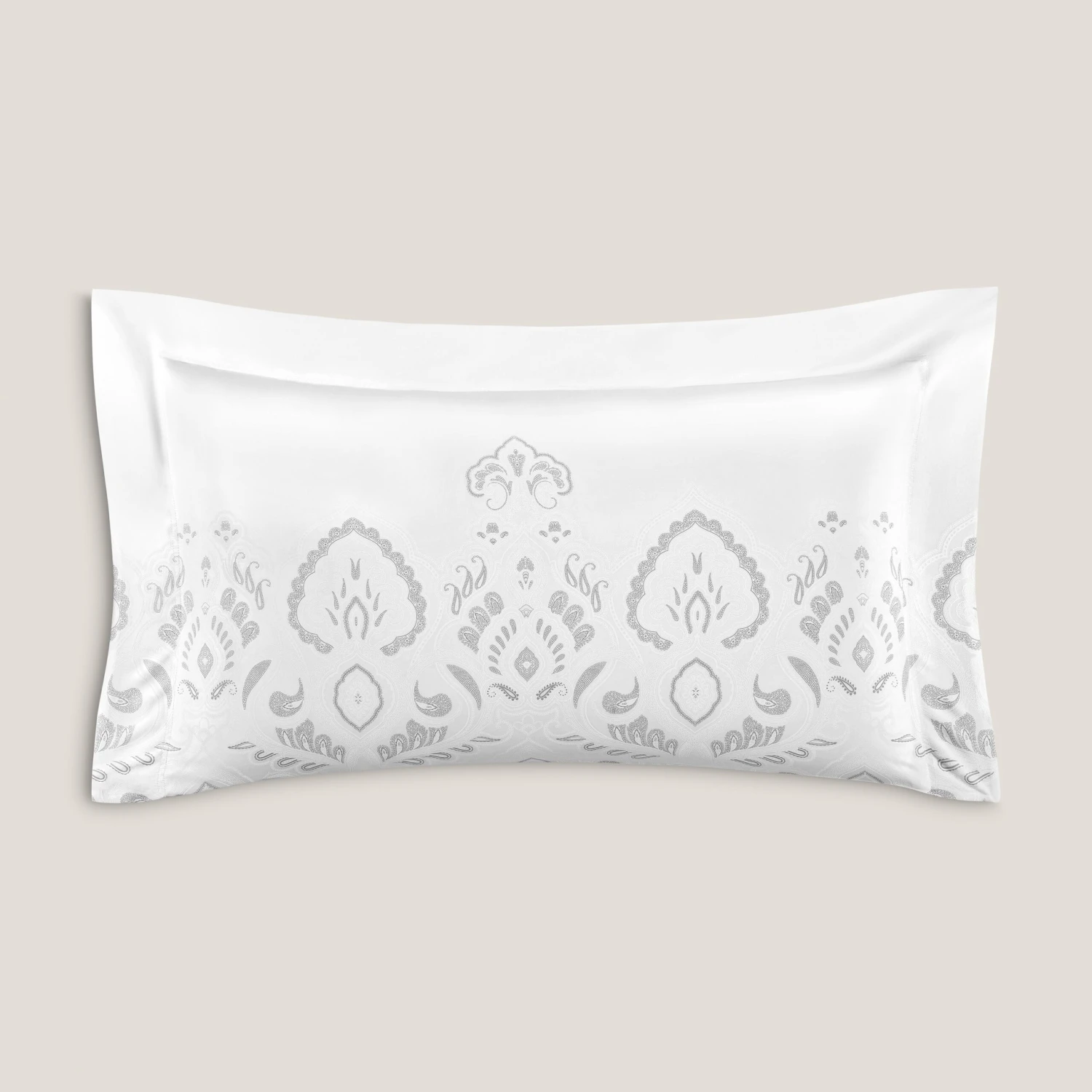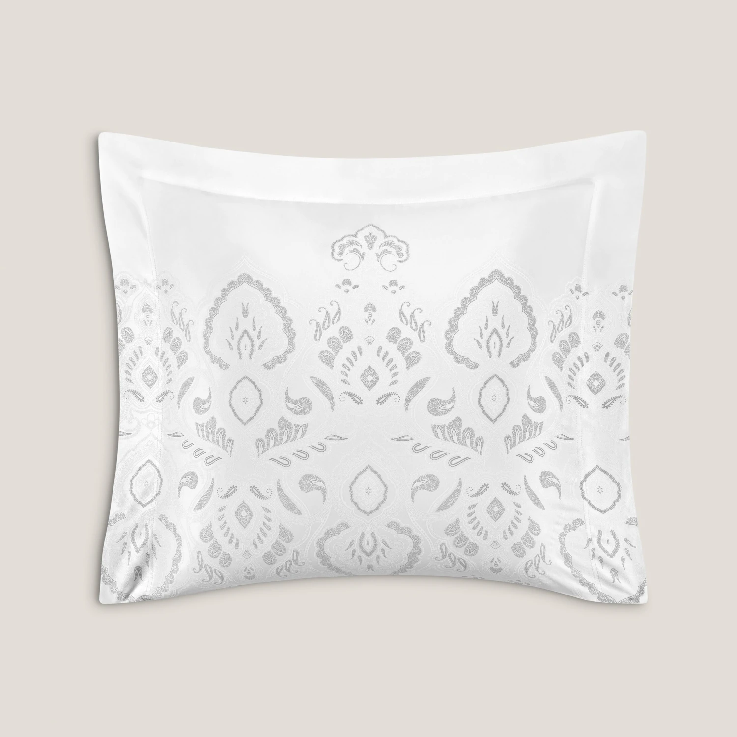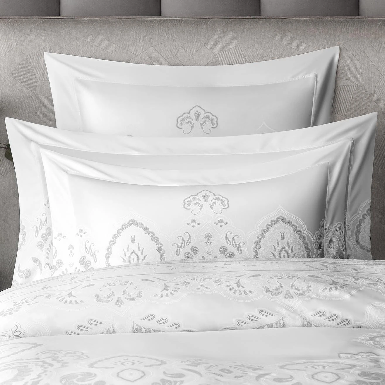 “Anassa” is grace, elegance and fragile beauty. The snow-white fabric embodies purity, peace and harmony. The thin contours of the classic ornament are like an imitation of a drawing with a silver-gray pencil, a light outline with strokes. This pattern also resembles the airy lace that bed linen is decorated with.