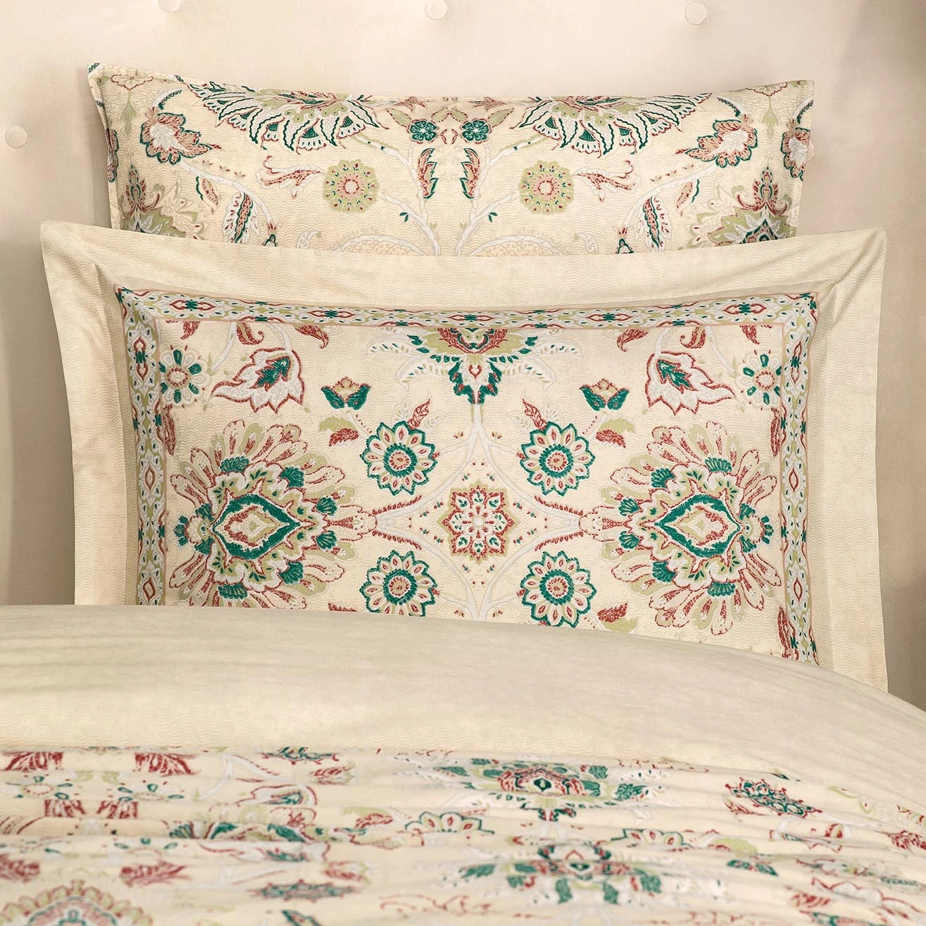 Stylized floral ornament “Dupree” – finely painted flowers in the classic French style. The main colors of the ornament are coral red and rich emerald green. Ornate interlacing lines and complex shapes of petals stand out against a delicate background of creamy ecru. The creamy-cream palette is typical for Provence-style interiors. Pillowcases are double-sided, on the reverse side decorated with a faint, barely noticeable retro pattern “scales”. This ornament has become one of the interior trends of recent years.