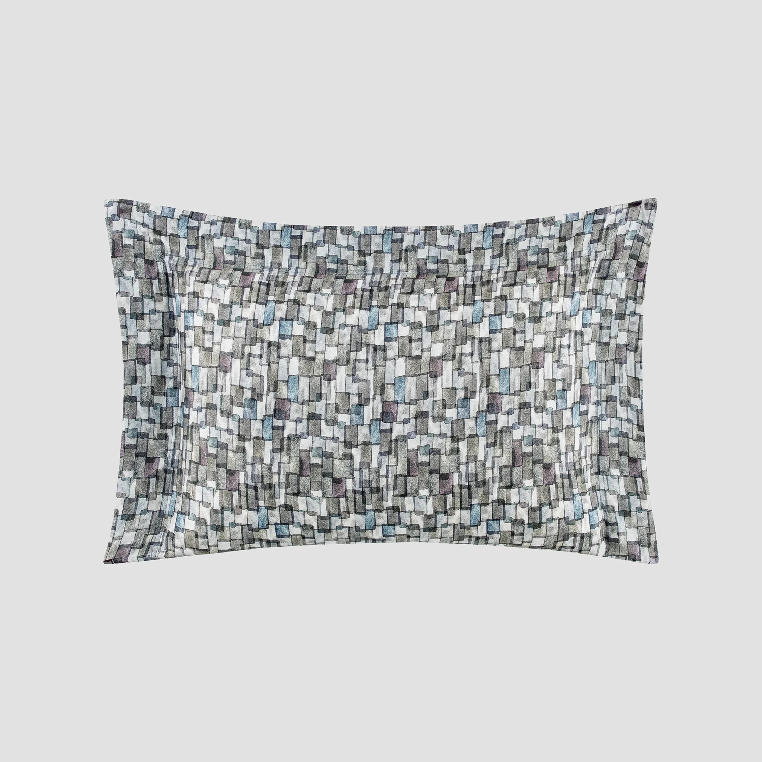 Gilbert bed linen is made in a restrained color palette. The set is decorated with an original print in watercolor technique with its characteristic blurring of contours. Mixing different colors of paint on the fabric creates a beautiful iridescence. The range of these color highlights is very deep, with complex combinations of shades from blue to green, from gold to wine, as if the colored glass pieces of a kaleidoscope were scattered. The noble steel-blue color of the sheet and the back of the pillowcase is the background that sets off the mosaic pattern.