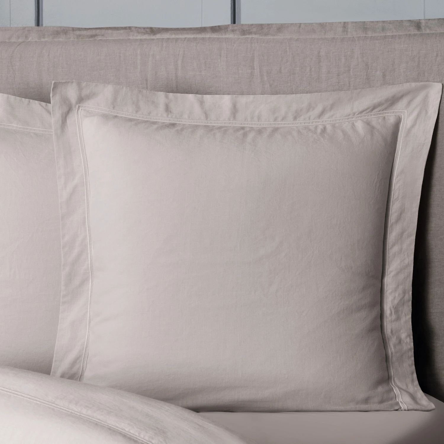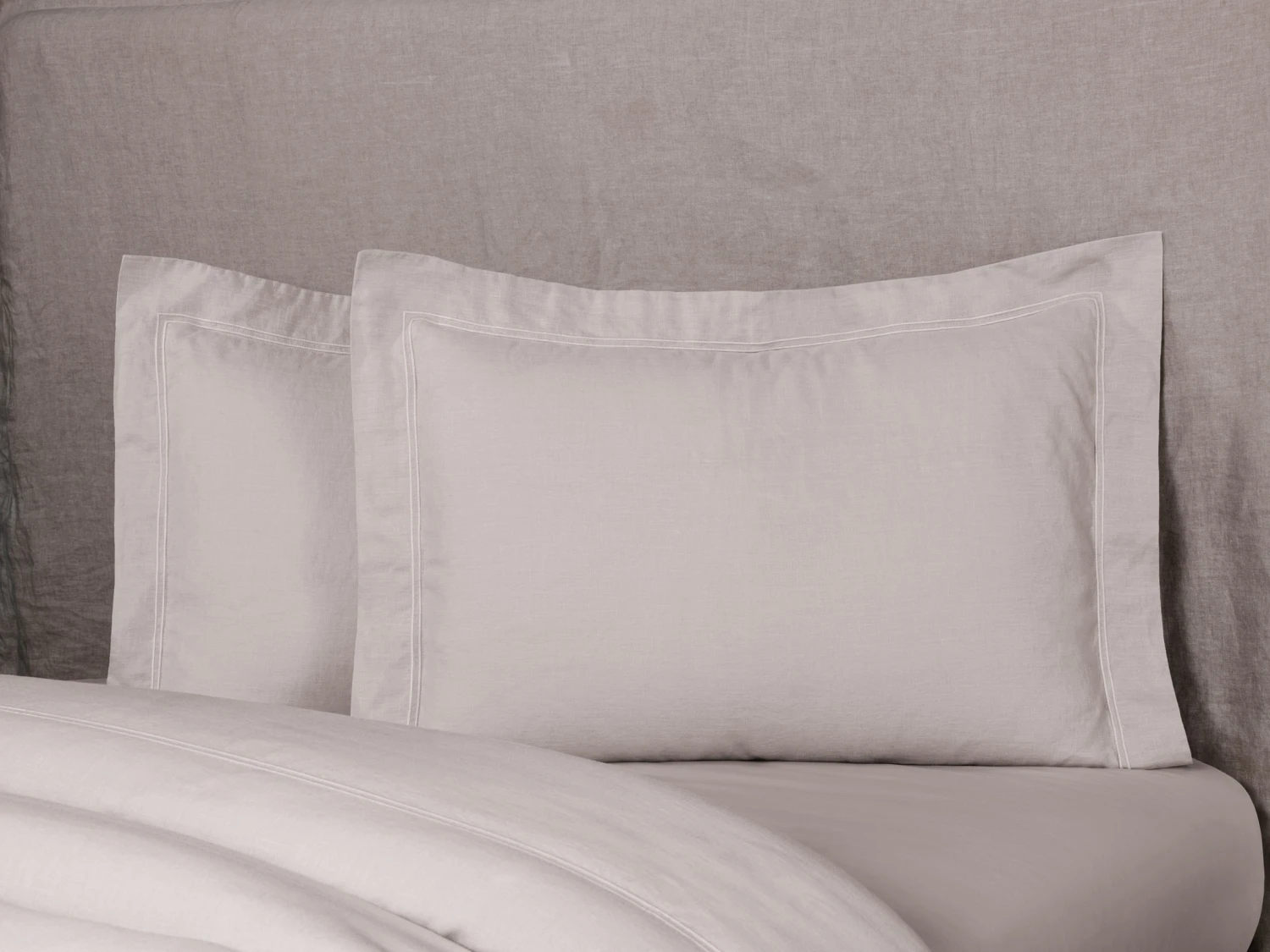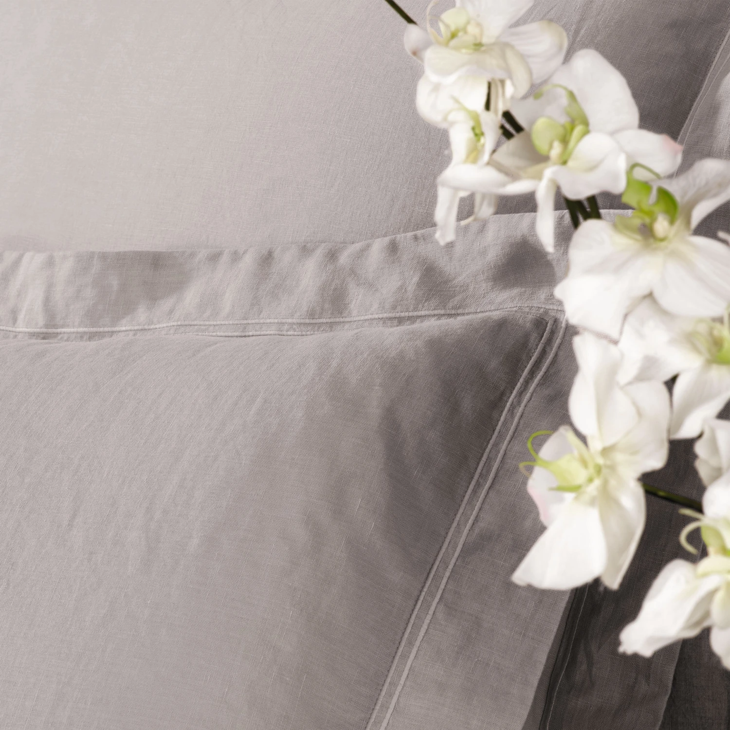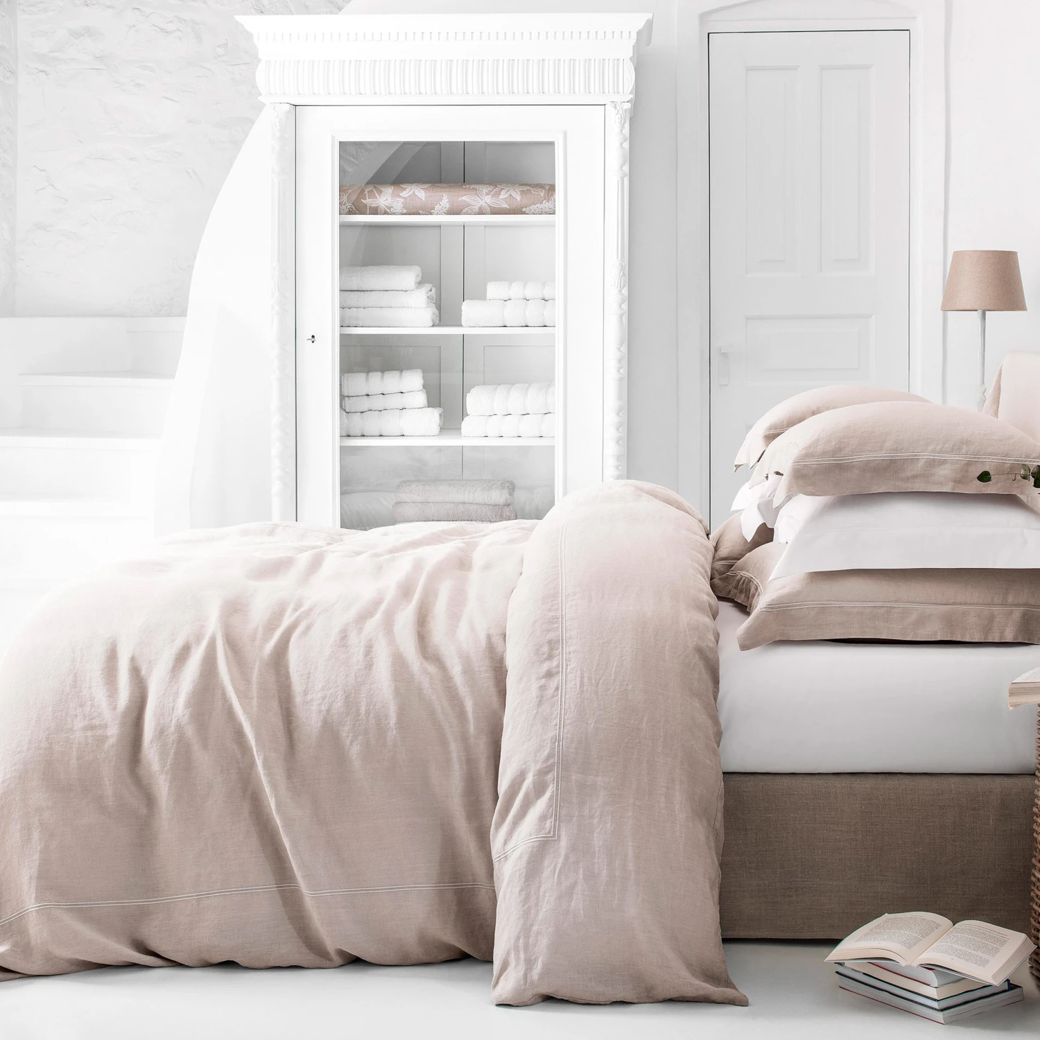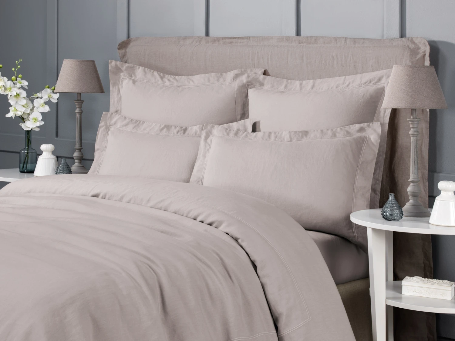 Organic bed linen is decorated with a broad border around the perimeter of the duvet cover and pillowcases, with a decorative solid color embroidery around its edges. This very strong, wear resistant material is subject to a special treatment ‘stone washing’ to achieve additional softness, lightness and the effect of a vintage distressed look. Both natural and artificial stones are used in the process, such as pumice stones and volcanic rock: they enhance the plasticity and flexibility of linen fibers. Such treatment results in a fabric that is very comfortable and practical and uniquely elegant; it acquires special softness, strength and a luxurious.