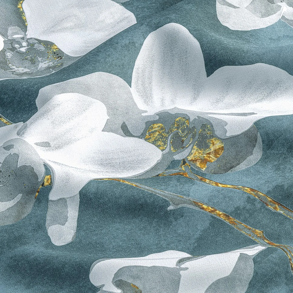 It is comfortable to sleep on in any season, while keeping your body cool in hot weather. The gentle, soft SENSOTEX® is designed for people with sensitive skin. The pillowcase set is adorned with a print featuring luxurious white royal orchids. The turquoise ground of the fabric brings out the whiteness of the flower. A delicate watercolor blur of colors softens the contrast of the intense shade and intricately drawn white petals, making it more refined and adding smokiness and halftones. “Samoa” takes us to the edge of the world, to the islands of Polynesia, filled with tropical flowers and turquoise hues of the warm ocean. Where the golden sand meets the turquoise of the lagoon.