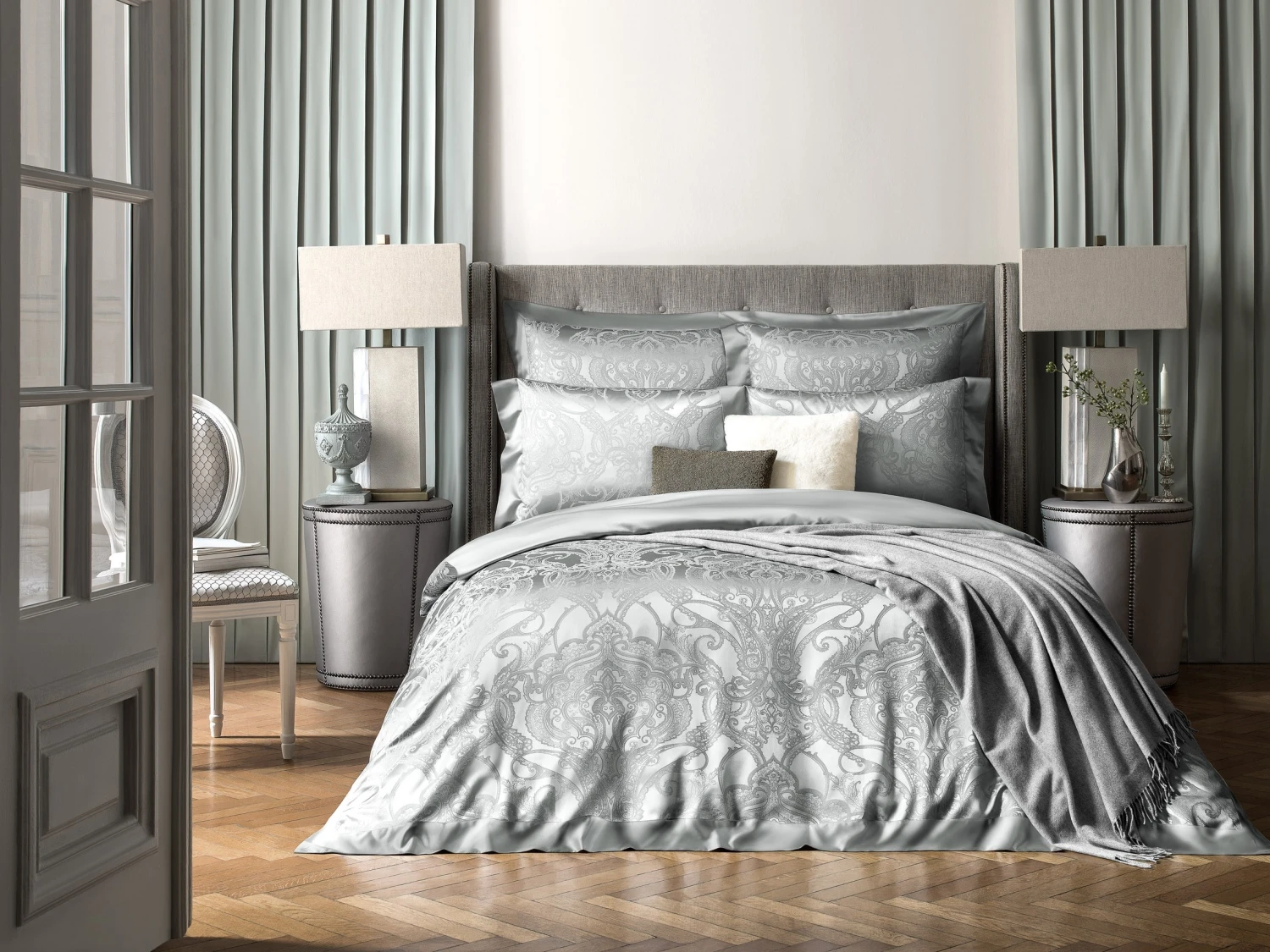 The complex weaving of the pattern is stylized leaves and flowers. It is the famous arabesque pattern, complemented by elements of the Venetian style. The fine texture of the jacquard fabric and the elegance of the ornament emphasizes the smooth, satin border of pillowcases and duvet cover.