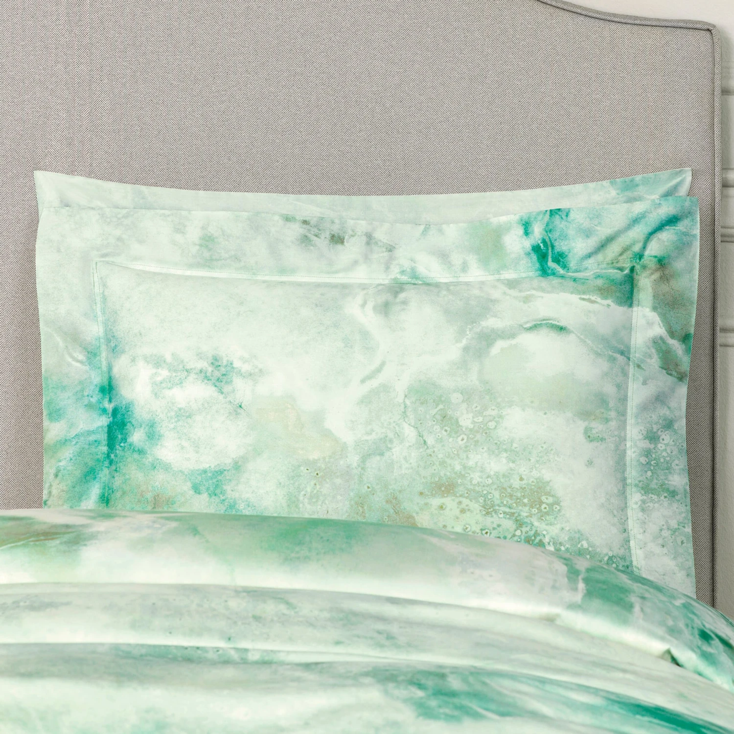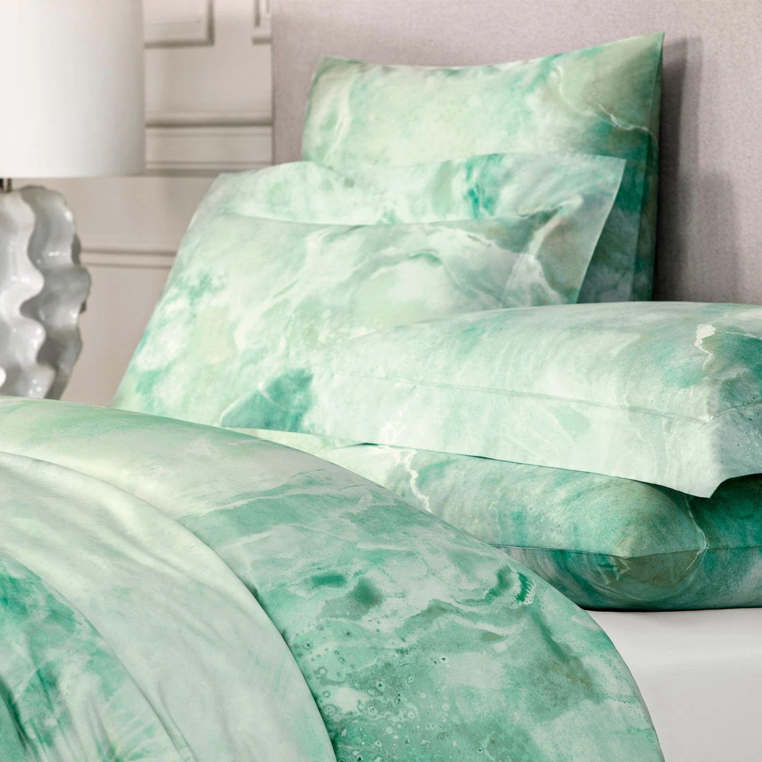 We used the best cultivars of long-stapled cotton to make this model. Cotton textiles are eco-friendly, does not accumulate static electricity nor cause discomfort, good at moisture absorbing and air-circulation. Such linen is easy to care for: if dried on a flat surface, the ironing won’t be necessary. The Terra pillowcases pattern is the nature’s quintessence, its unparalleled beauty: sophisticated and delicate marble patterns, unique patterns of rare minerals, amazing wood textures, colors of such natural elements as water, earth and stone. Natural shades of delicate greenery dip us into spring freshness and symbolize nature’s annual renewal and rebirth.