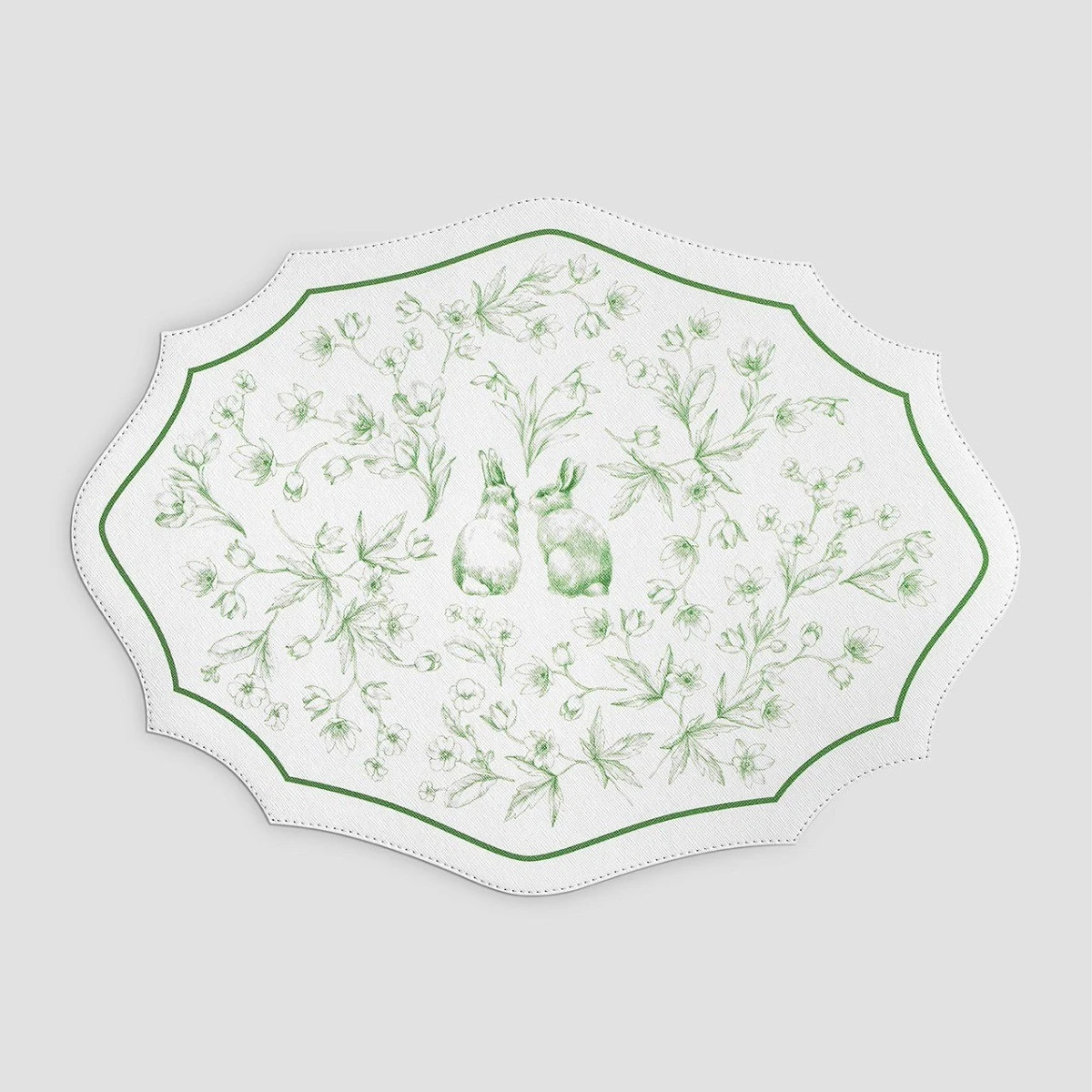 Falber is white color, intricate ornate edges and an Easter-themed ornament. The placemat is double-sided – the front side is decorated with a fine monochrome print – bunnies among the gorgeous flowers. A pastel pattern in the shades of the first spring greenery will be an additional decoration for a celebration.
