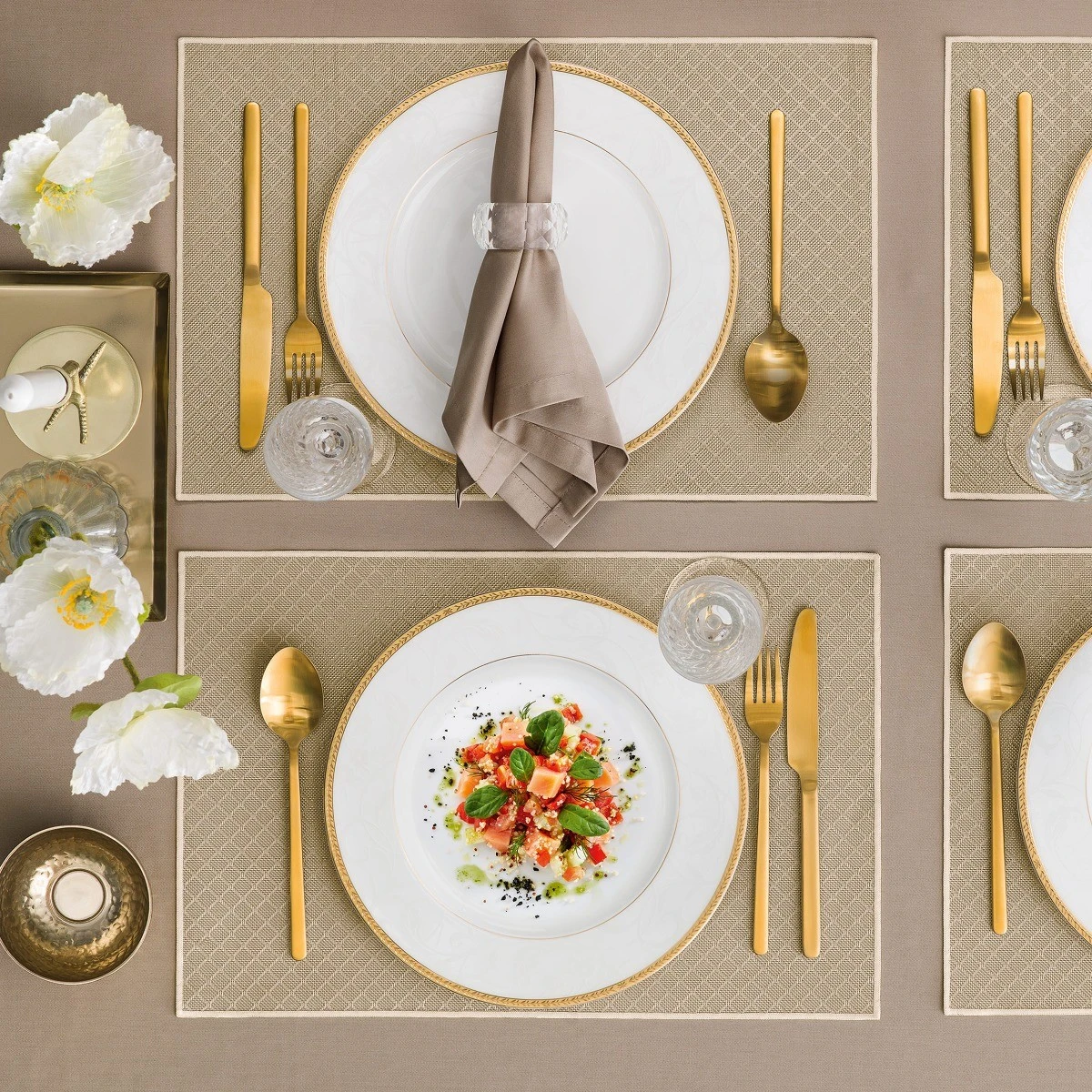 Fernando resembles a golden textile item, but unlike textile placemats perfectly protects the table against moisture. The fine geometric ornament on its surface resembles a relief pattern made in the jacquard weaving technique. This model looks elegant and will become a decoration of the table. The golden shade of Fernando looks great for festive serving.