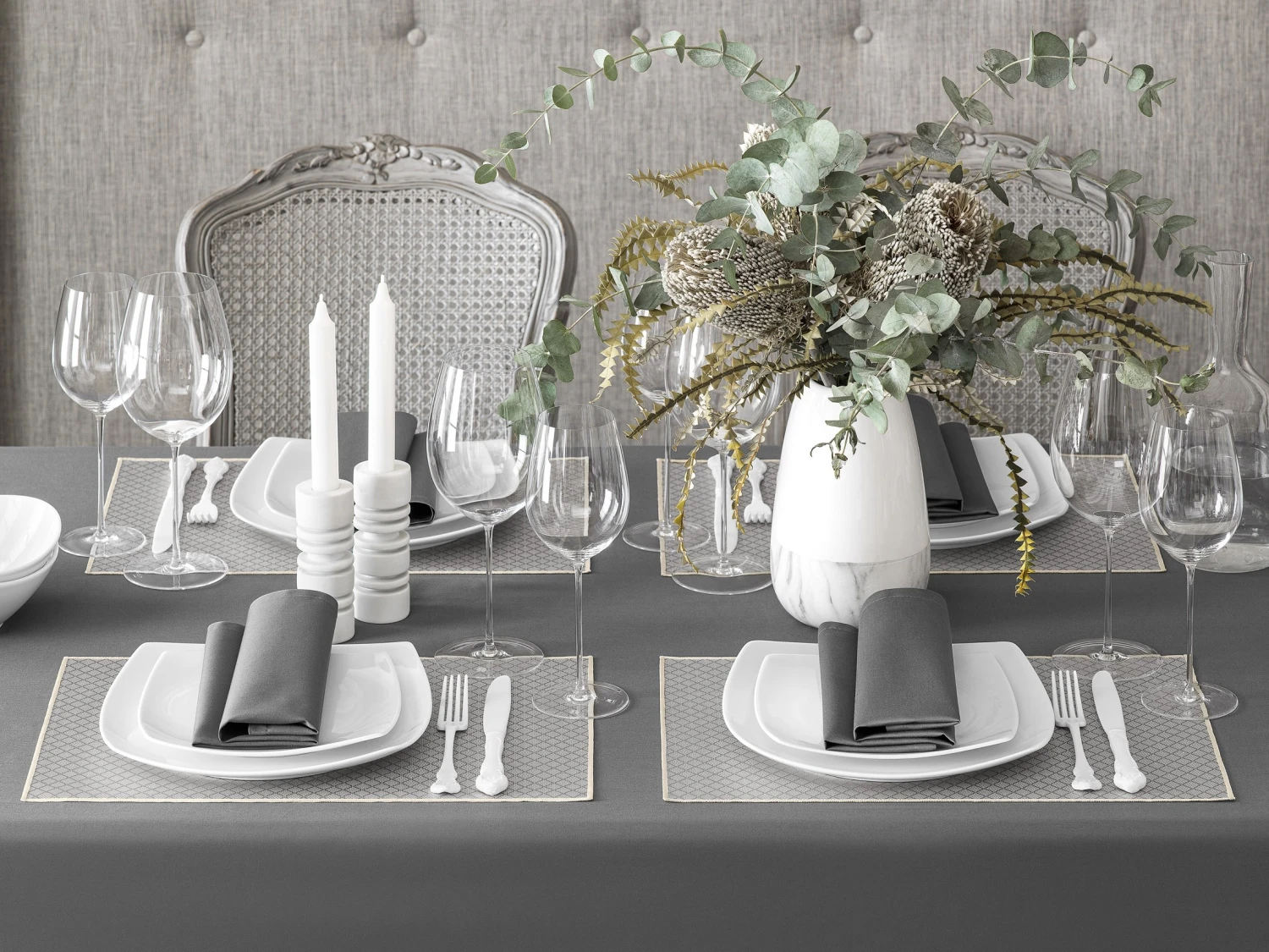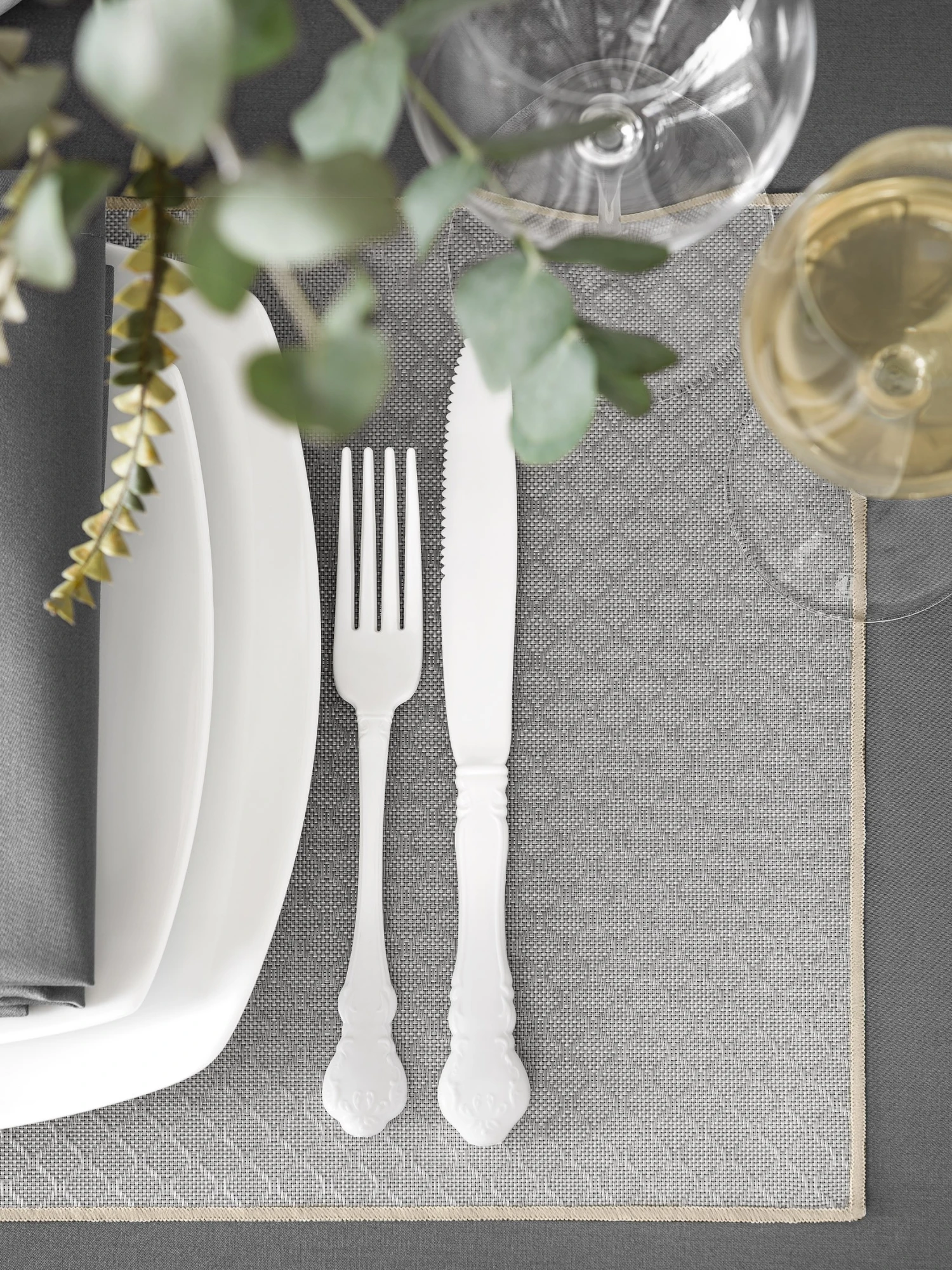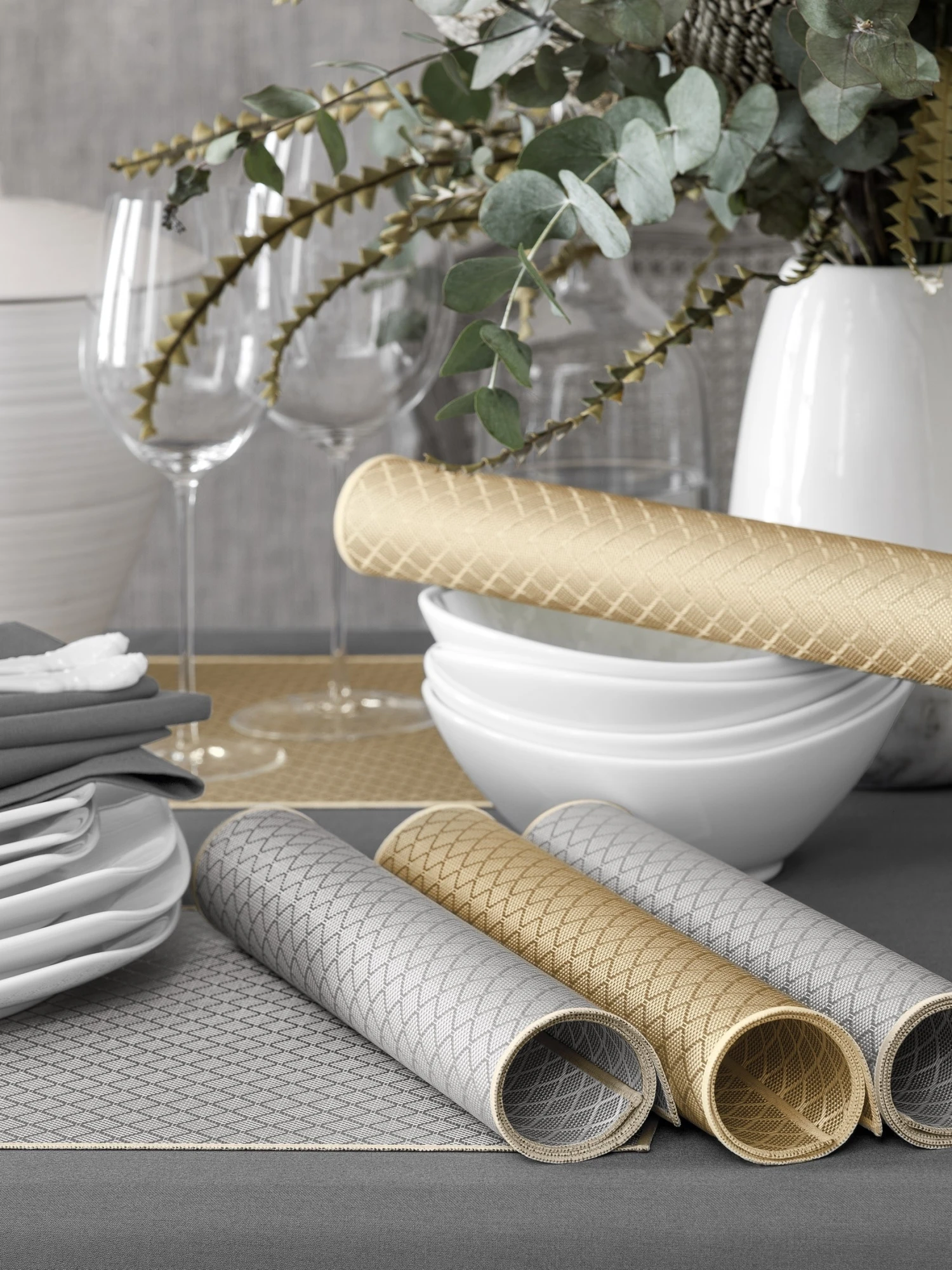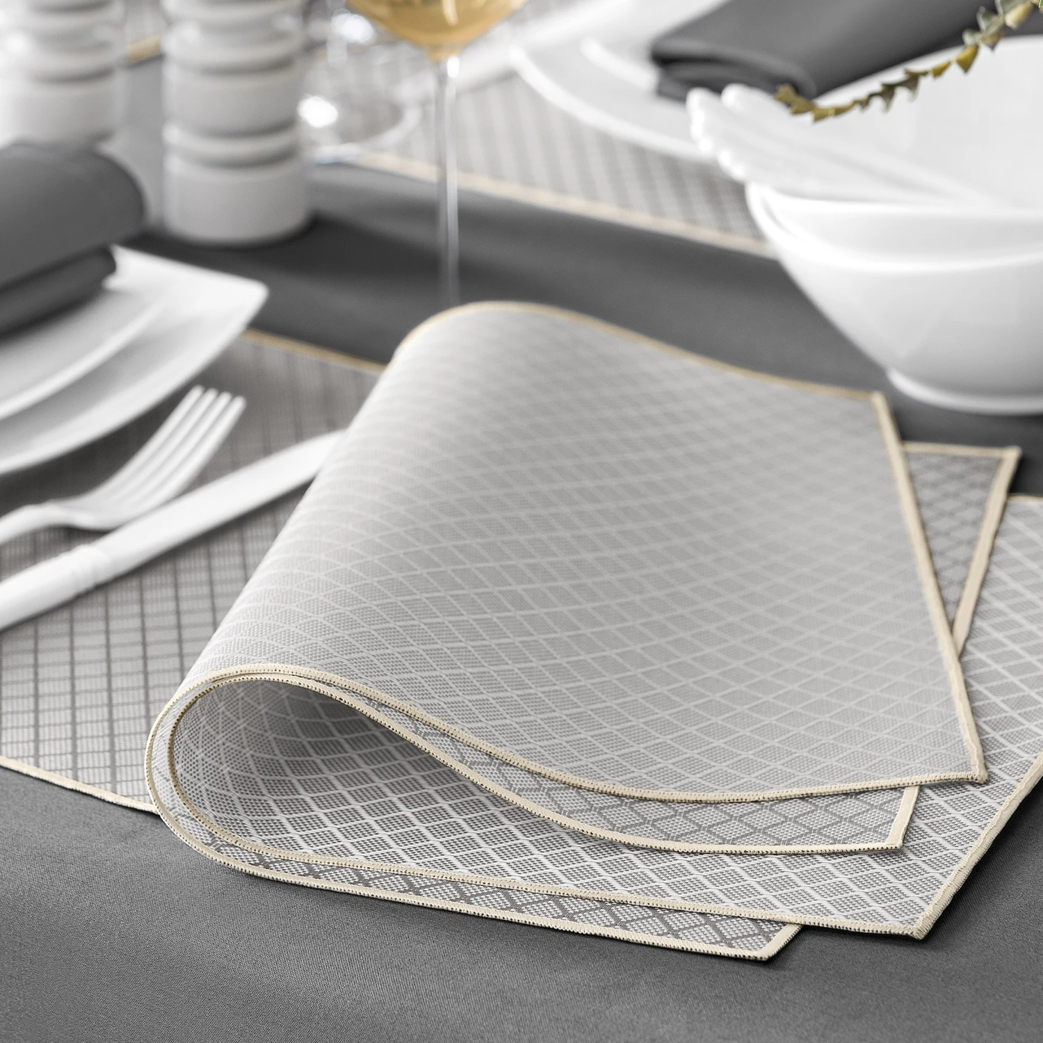 ‘Griffin’ resembles a textile product made of beautiful silver-gray jacquard fabric. The small geometric ornament that stands out on the surface of the placemat is similar to the pattern made in the jacquard weaving technique. The discreet, calm color of this model will look great in any setting.