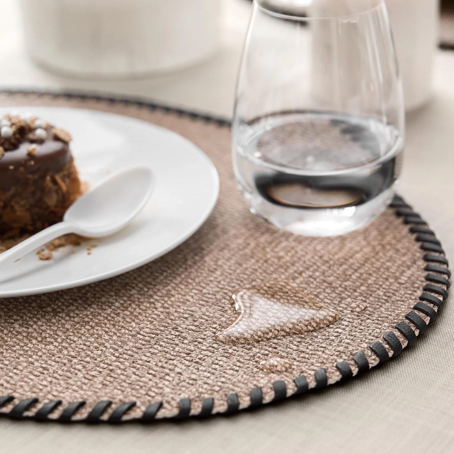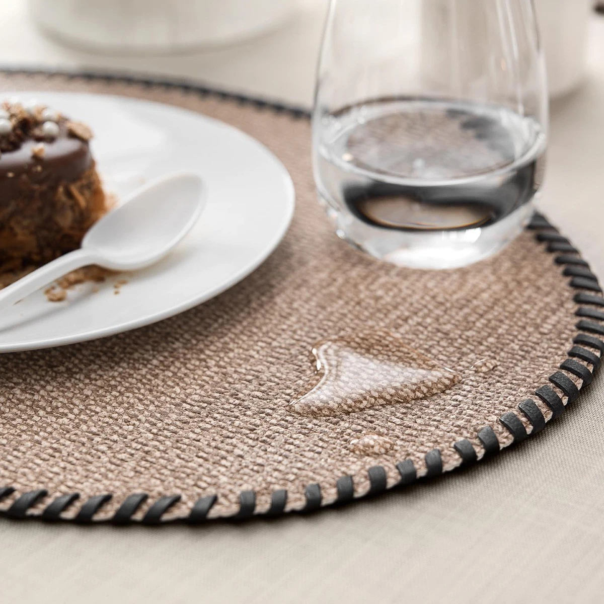 The dense placemat material is elastic and very durable, resistant to scuffing and does not deform. Such placemats do not absorb water and are easy to clean.