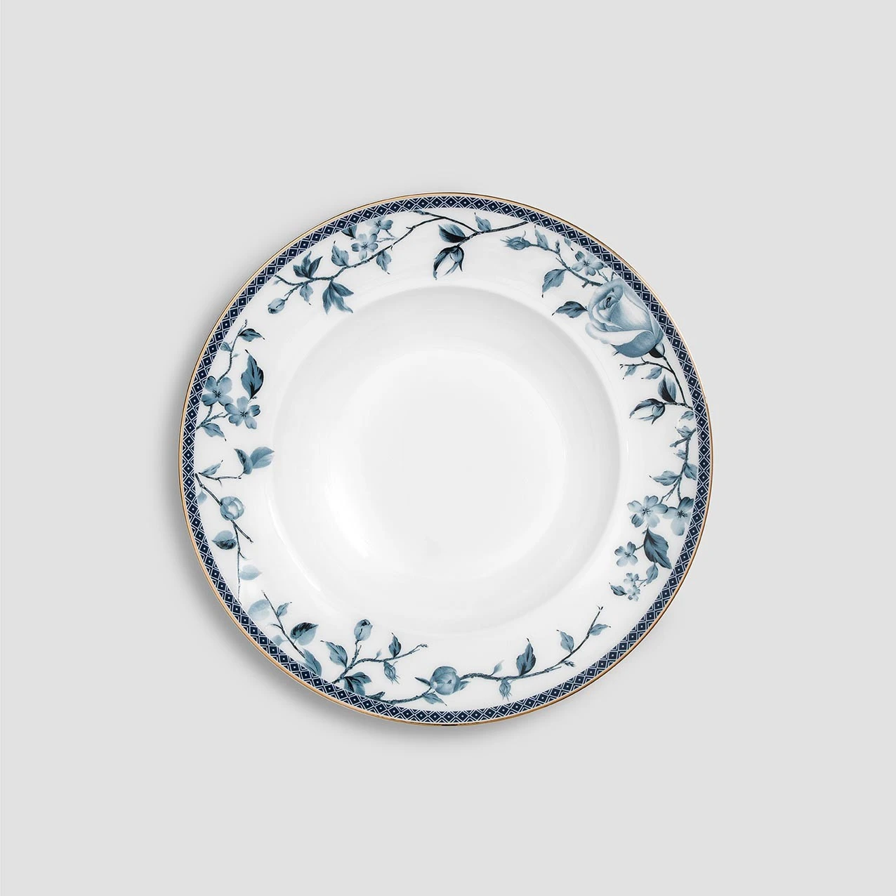A deep soup plate is decorated with a pattern made in the decal technique. The plates in the Fiore collection feature an exquisite medium blue pattern and a glittering gilded rim around of the plate. Such dishes are reminiscent of the famous English Wedgwood porcelain with its characteristic fine ornaments.